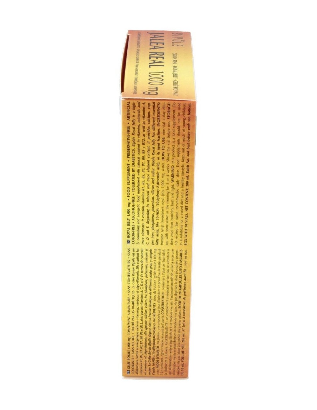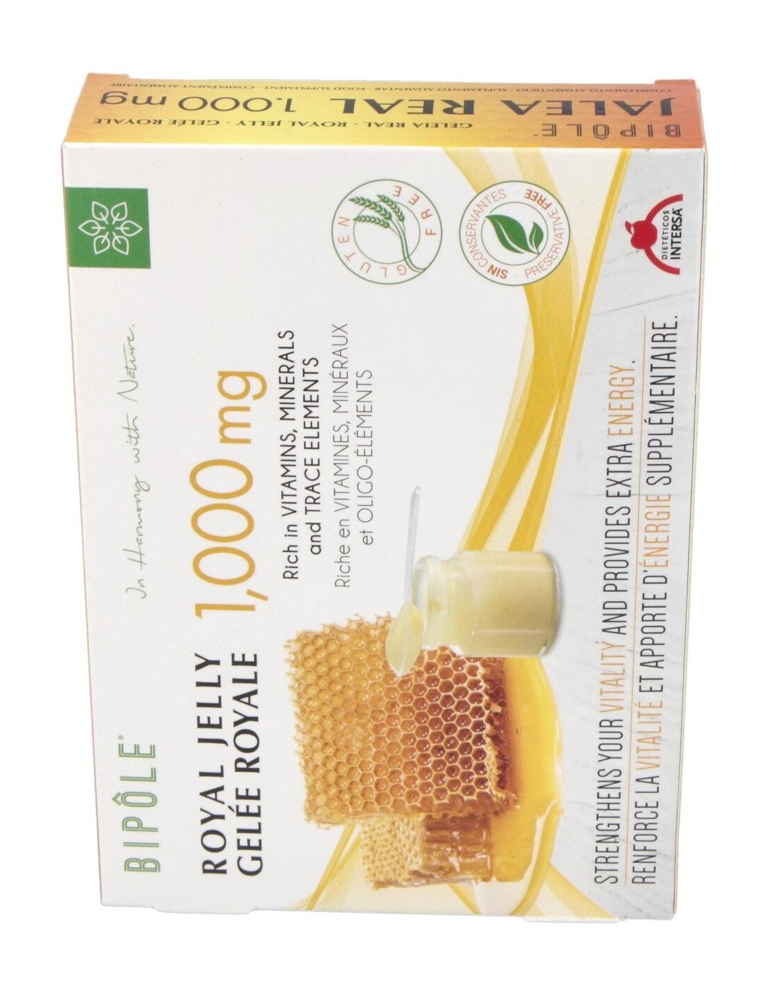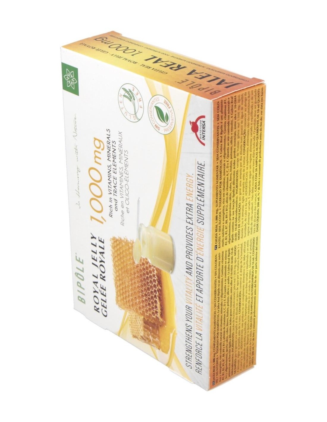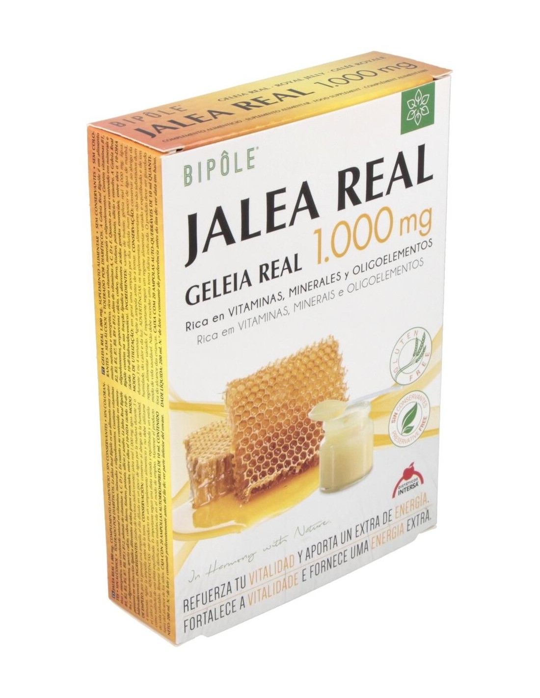 Complemento alimenticio a base de jalea real, sustancia rica en vitaminas, minerales y oligoelementos. Favorece el correcto desempeño físico y mental. A lajalea real se le atribuyen propiedades reconstituyentes y tonificantes. Caja de 20 ampollas de 10ml. Indicado para adultos.