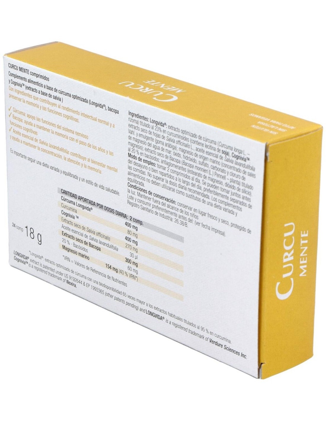 Longvida®: extracto optimizado de cúrcuma (Curcuma longa L. ¿ rizoma) titulado al 23% en curcuminoides (contiene lecitina de soja): CogniviaTM: extracto seco patentado de hojas de Salvia officinalis L., aceite esencial de Salvia lavandulifolia Vahl. y emulgente (goma arábiga): magnesio de origen marino (concentrado de sales de magnesio del agua de mar: óxido, hidróxido, sulfato, carbonato y cloruro de magnesio): extracto seco de Bacopa (Bacopa monnieri (L.) Pennell planta) titulado al 20 % en bacósidos: antiaglomerantes (estearato de magnesio, dióxido de silicio).Longvida®: extracto optimizado de cúrcuma con una biodisponibilidad 65 veces mayor a los extractos habituales titulados al 95% en curcumina.