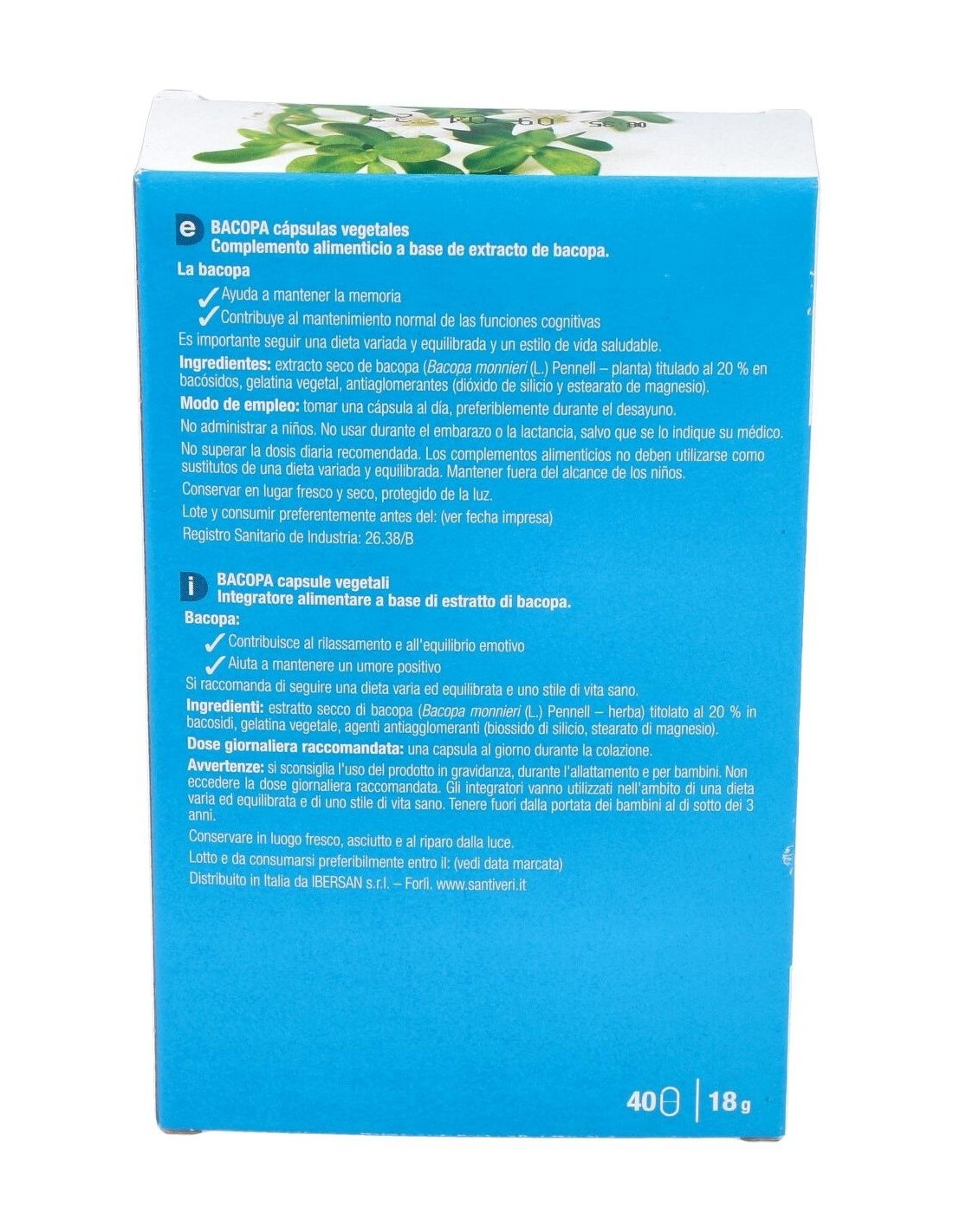 Santiveri Plantas Fit Bacopa 40Caps es un complemento alimenticio a base de jugo de aloe vera, de extracto seco de bacopa, gelatina vegetal y antiaglomerantes. Contribuye a la relajación y al equilibrio emocional.