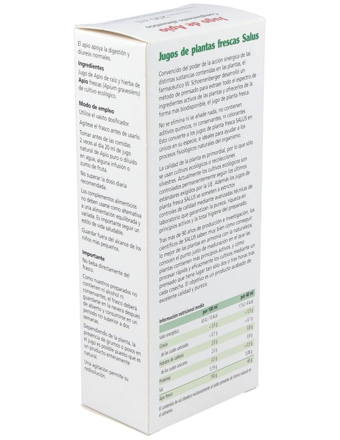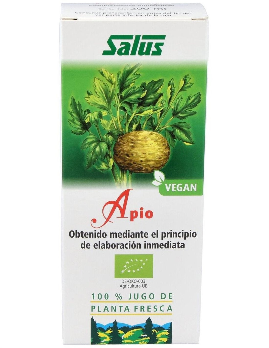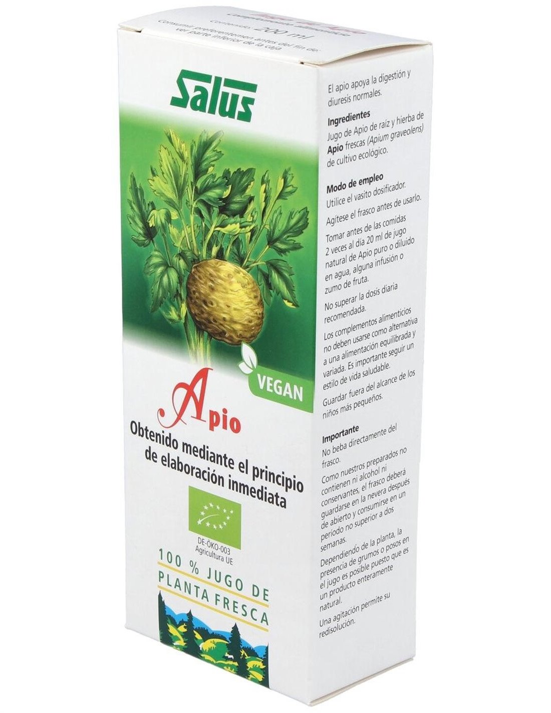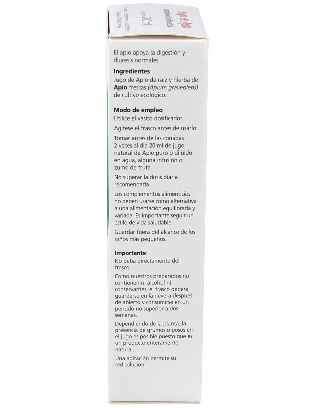 Ingredientes:Jugo natural de planta fresca de tubérculos y hojas frescas de apio de cultivo ecológico. Modo de empleo:Tomar antes de las comidas dos veces al día 20 ml de jugo natural de apio diluido en 120 ml de agua o de alguna infusión. Presentación:Frasco de 200 ml.