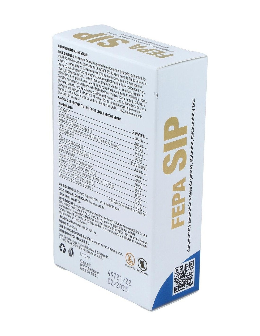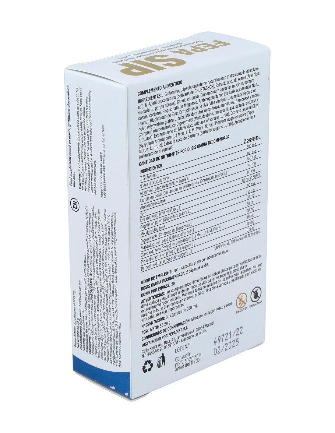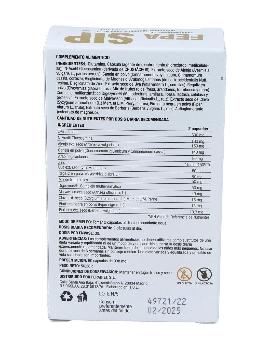 L-Glutamina, Cápsula (agente de recubrimiento (hidroxipropilmetilcelulosa)), N Acetil Glucosamina (derivada de CRUSTÁCEOS), Extracto seco de Ajenjo (Artemisia vulgaris L., partes aéreas), Canela en polvo (Cinnamomum zeylanicum, Cinnamomum cassia, corteza), Bisglicinato de Magnesio, Arabinogalactanos (de Larix occidentalis Nutt., resina), Bisglicinato de Zinc, Extracto seco de Uva (Vitis vinifera L., semillas), Regaliz en polvo (Glycyrrhiza glabra L. raíz), Mix de frutos rojos (fresa, arándanos, frambuesa y mora), Complejo multienzimático Digezyme® (Maltodextrina, amilasa, lipasa, lactasa, celulasa y proteasa), Extracto seco de Malvavisco (Althaea officinalis L., raíz), Extracto seco de Clavo (Syzygium aromaticum (L.) Merr. et L.M. Perry., flores), Pimienta negra en polvo (Piper nigrum L., fruto), Extracto seco de Berberis (Berberis vulgaris L., raíz), Antiaglomerante (estearato de magnesio).