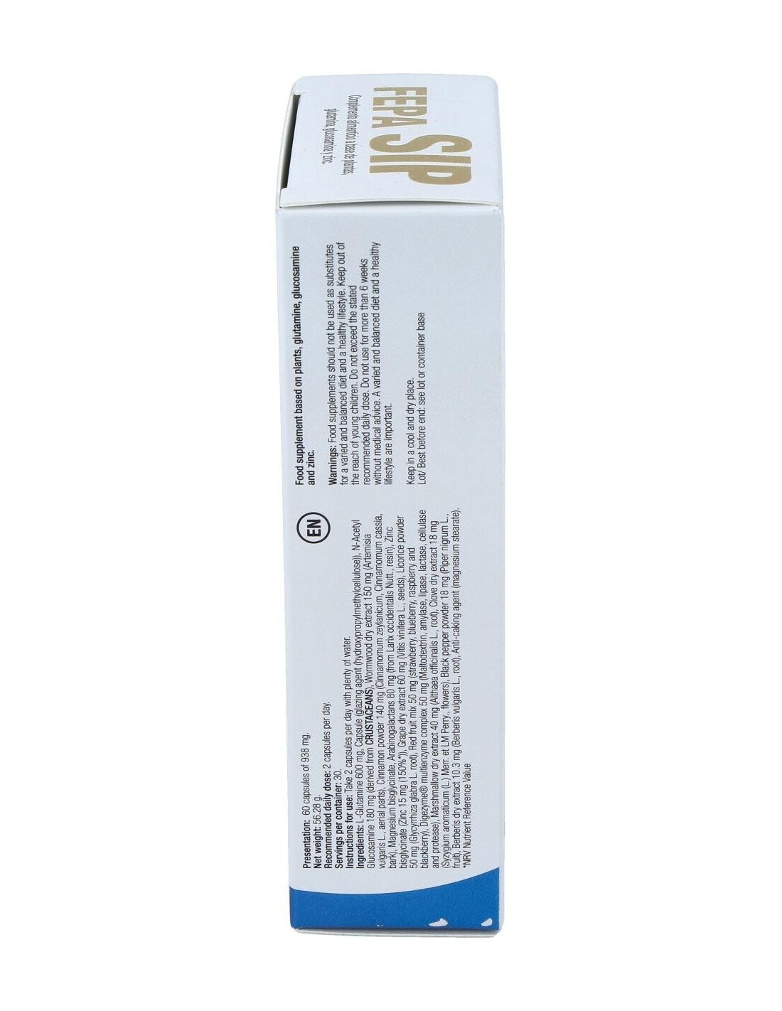 Suplemento a base de plantas, glutamina, glucosamina y zinc. El Zinc contribuye a la síntesis normal del ADN y a la protección de las células frente al daño oxidativo.