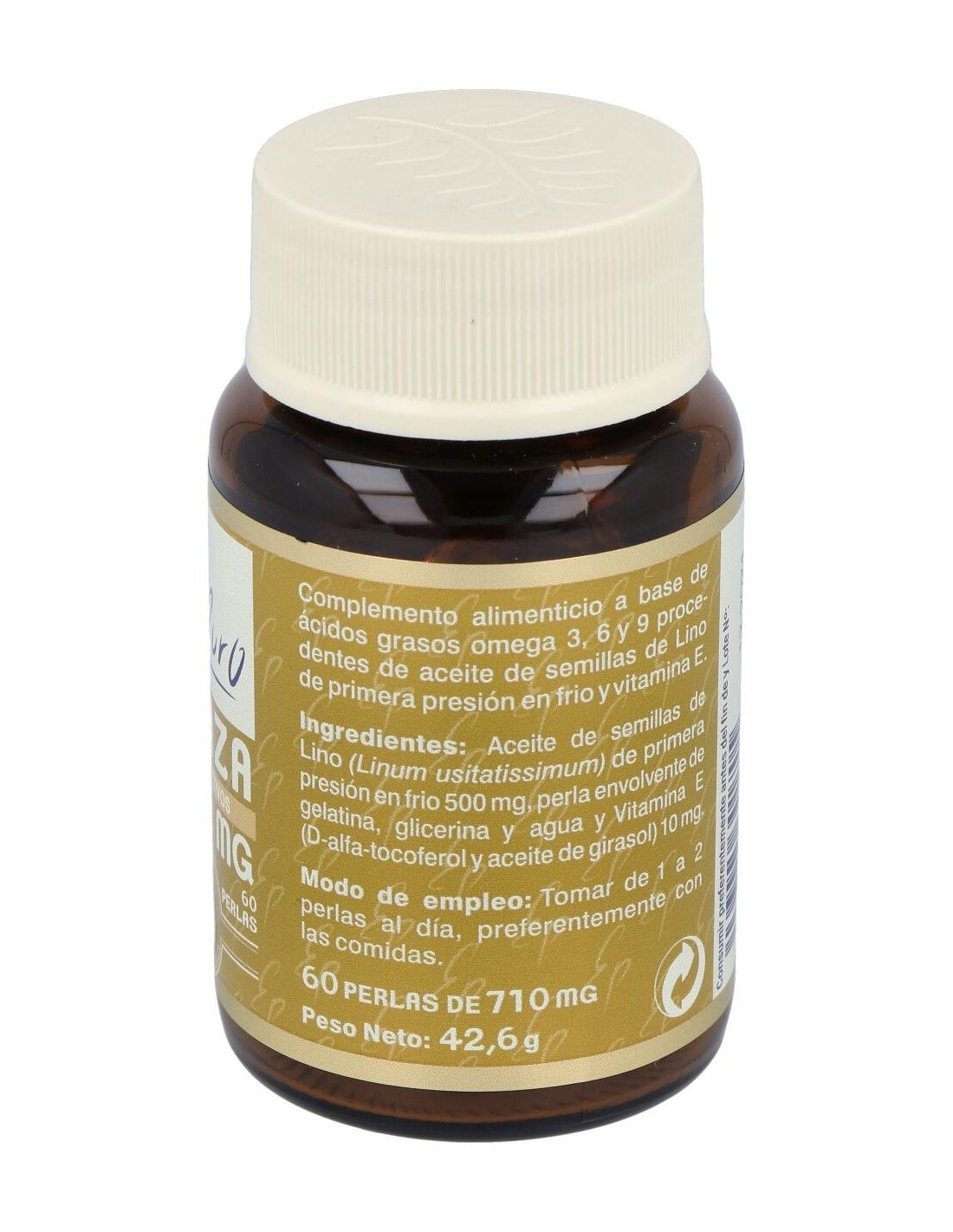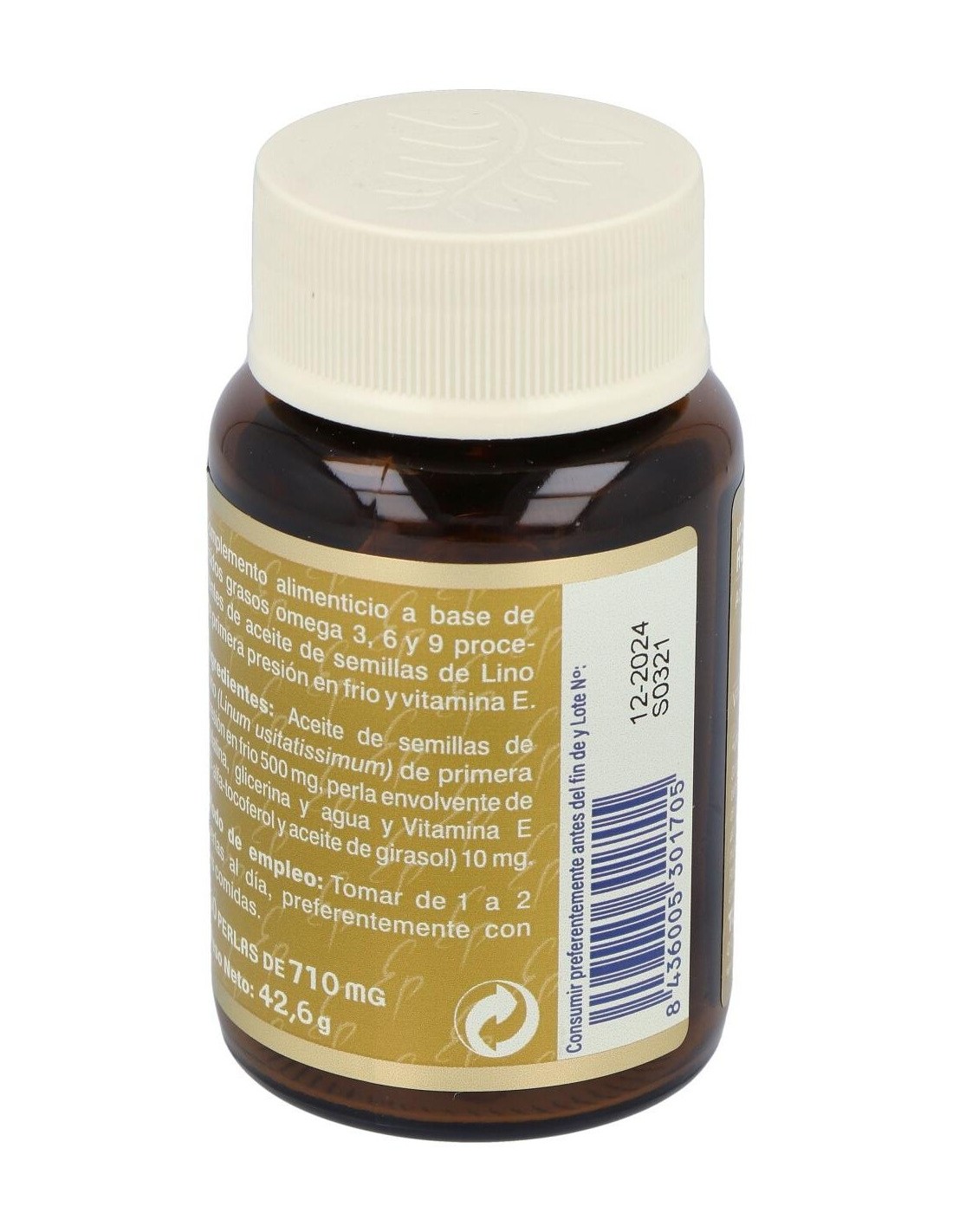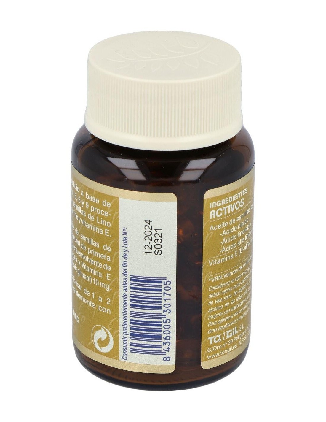 Complemento alimenticio a base de ácidos grasos omega 3, 6 y 9 procedentes de aceite de semillas de Lino de primera presión en frio y vitamina E.