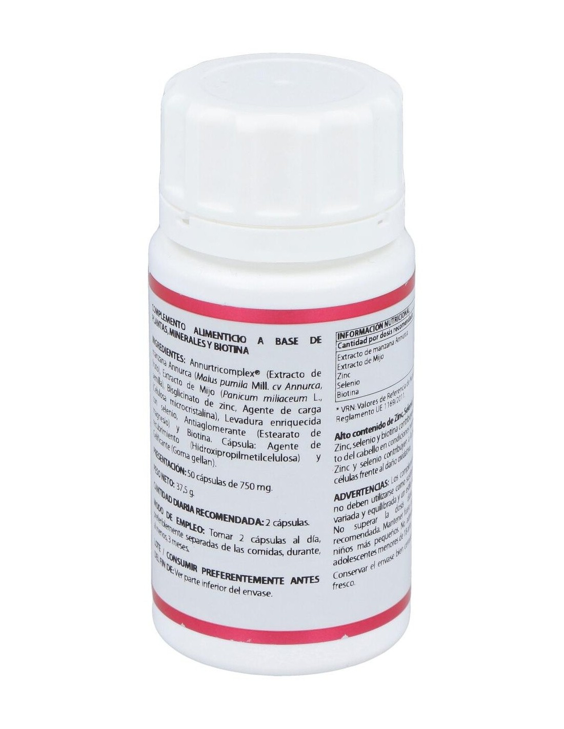 Annurtricomplex® (extracto de manzana Annurca (Malus pumila Mill., cultivar Annurca, fruto, alto contenido de procianidinas oligoméricas), 400 mg: mijo extracto seco (Panicum miliaceum L., semilla, 5% miliacina), 100 mg: bisglicinato de zinc (10% zinc), 50 mg: levadura enriquecida con selenio (1000 µg Se/g), 27,5 mg: biotina, 25 µg. Excipientes tecnológicos: celulosa microcristalina (agente de carga), c.s. y estearato de magnesio (antiaglomerante), c.s. Envoltura: agente de recubrimiento (hidroxipropilmetilcelulosa) y gelificante (goma gellan).