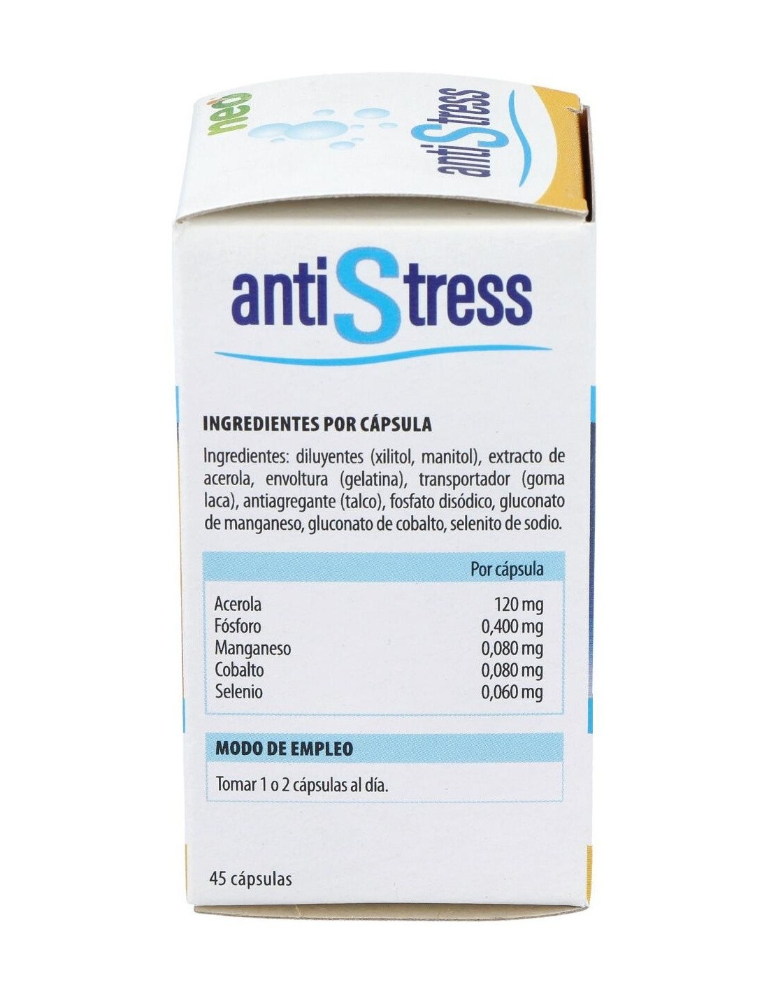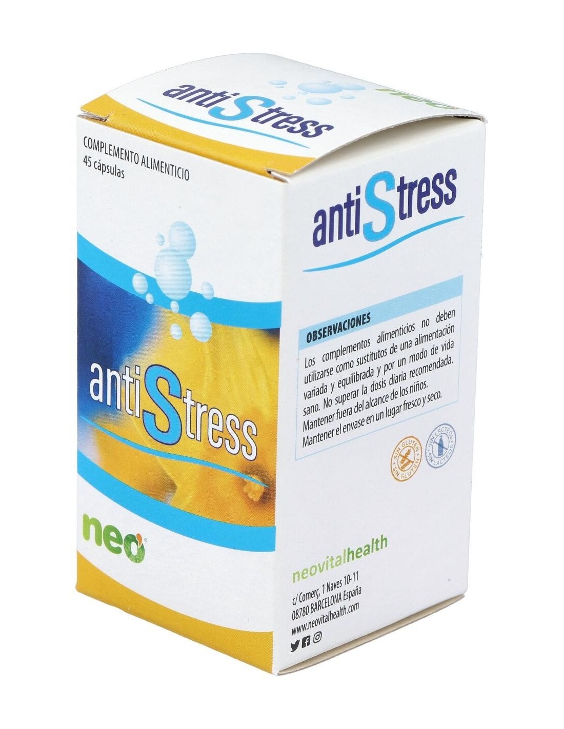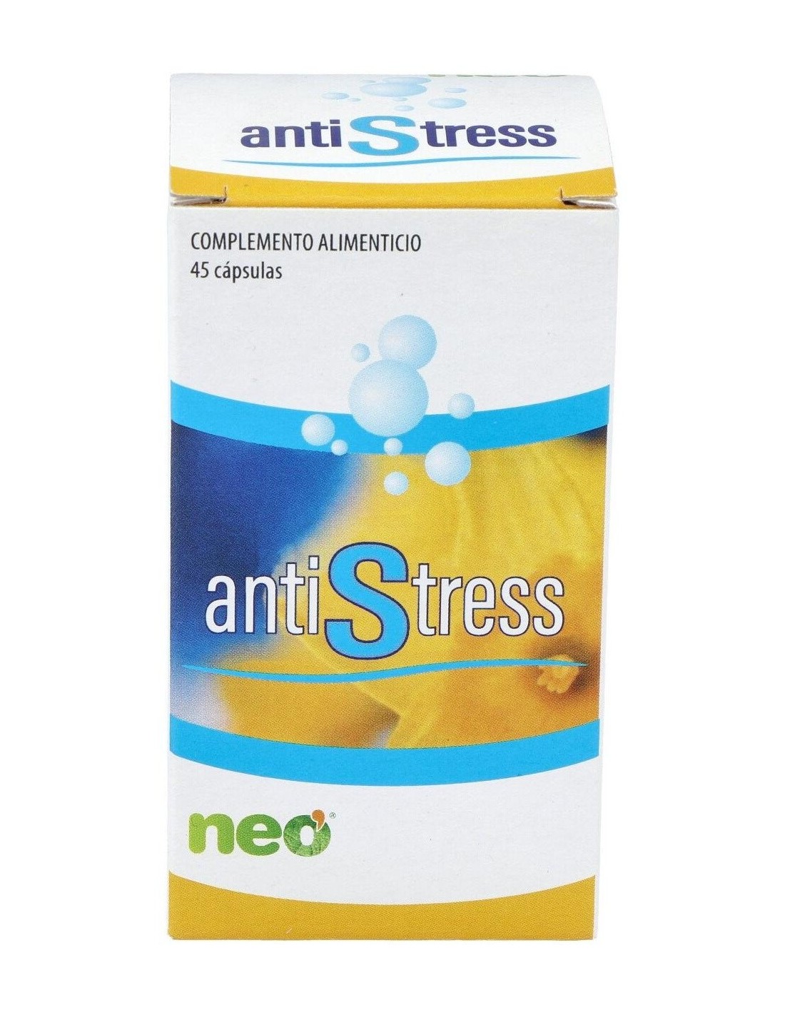 Las cápsulas Antiestress Plus de Neo es un suplemento alimenticio que favorece la relajación y disminuye los síntomas de estrés y nervios que se generan en tu vida cuotidina. Indicado para personas con trabajos ajetreados, estudiantes en épicas de exámenes y personas muy nerviosas. Elaborado con ingredientes naturales, aporta los nutrientes necesarios para evitar las situaciones de estrés y nervios.