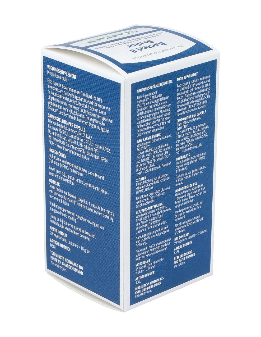 Ofrece una mezcla equilibrada de 8 cepas bacterianas formulada especialmente para personas de edad avanzada. Las cápsulas DRcaps®, fáciles de tragar y aptas para vegetarianos, protegen a las bacterias contra el ácido gástrico.