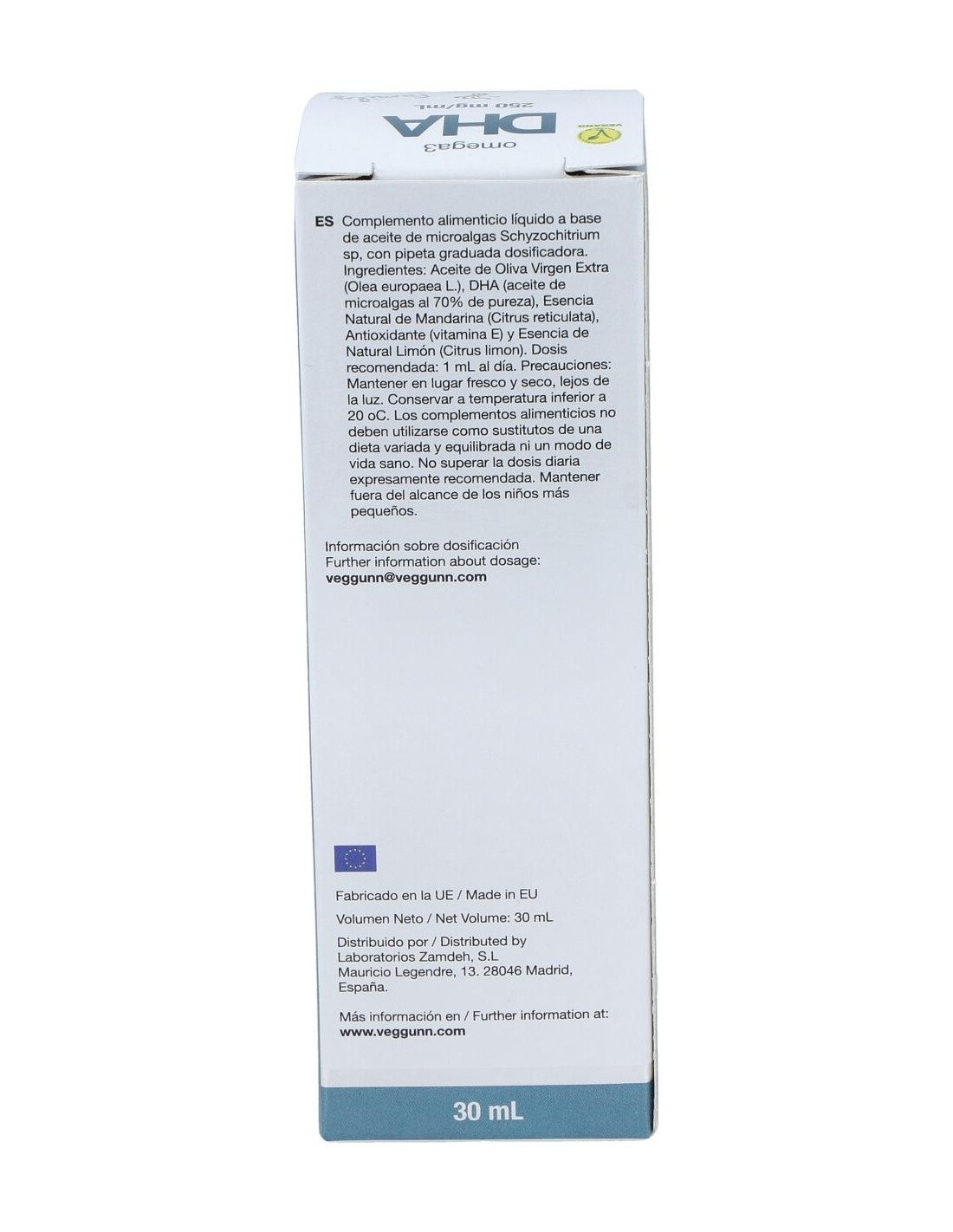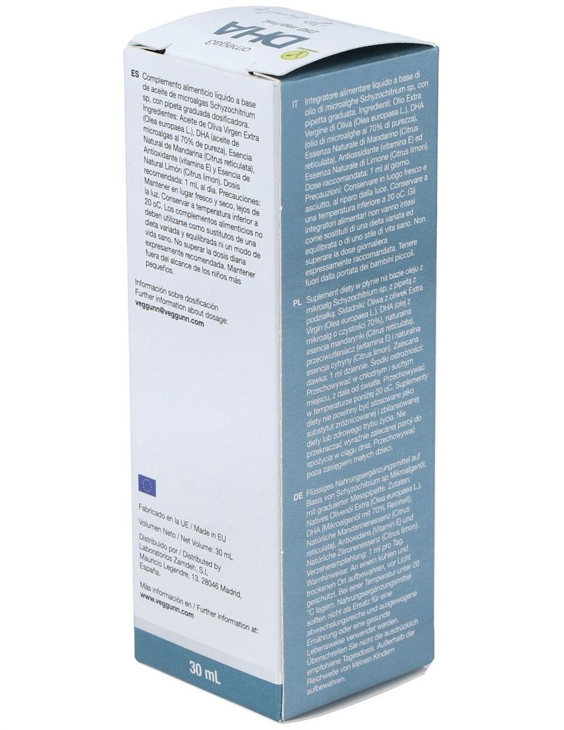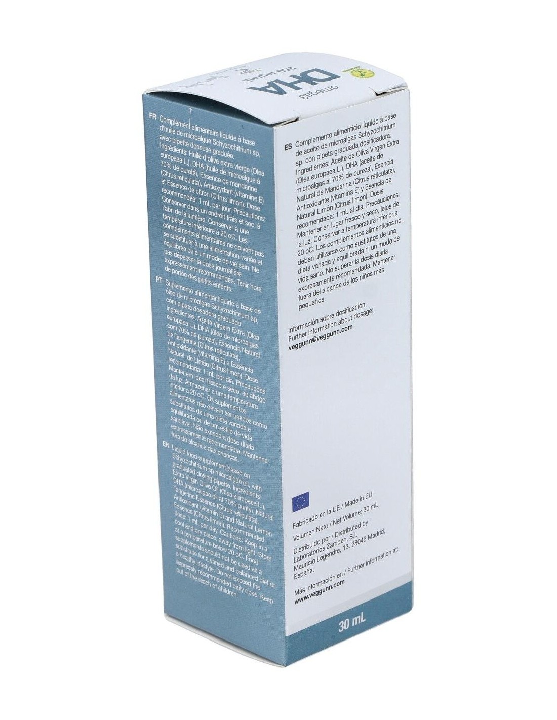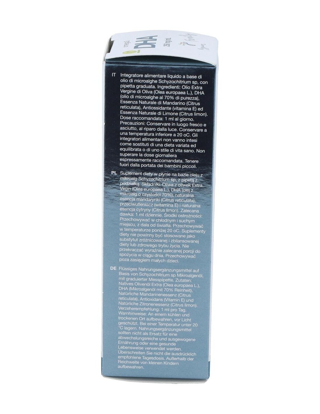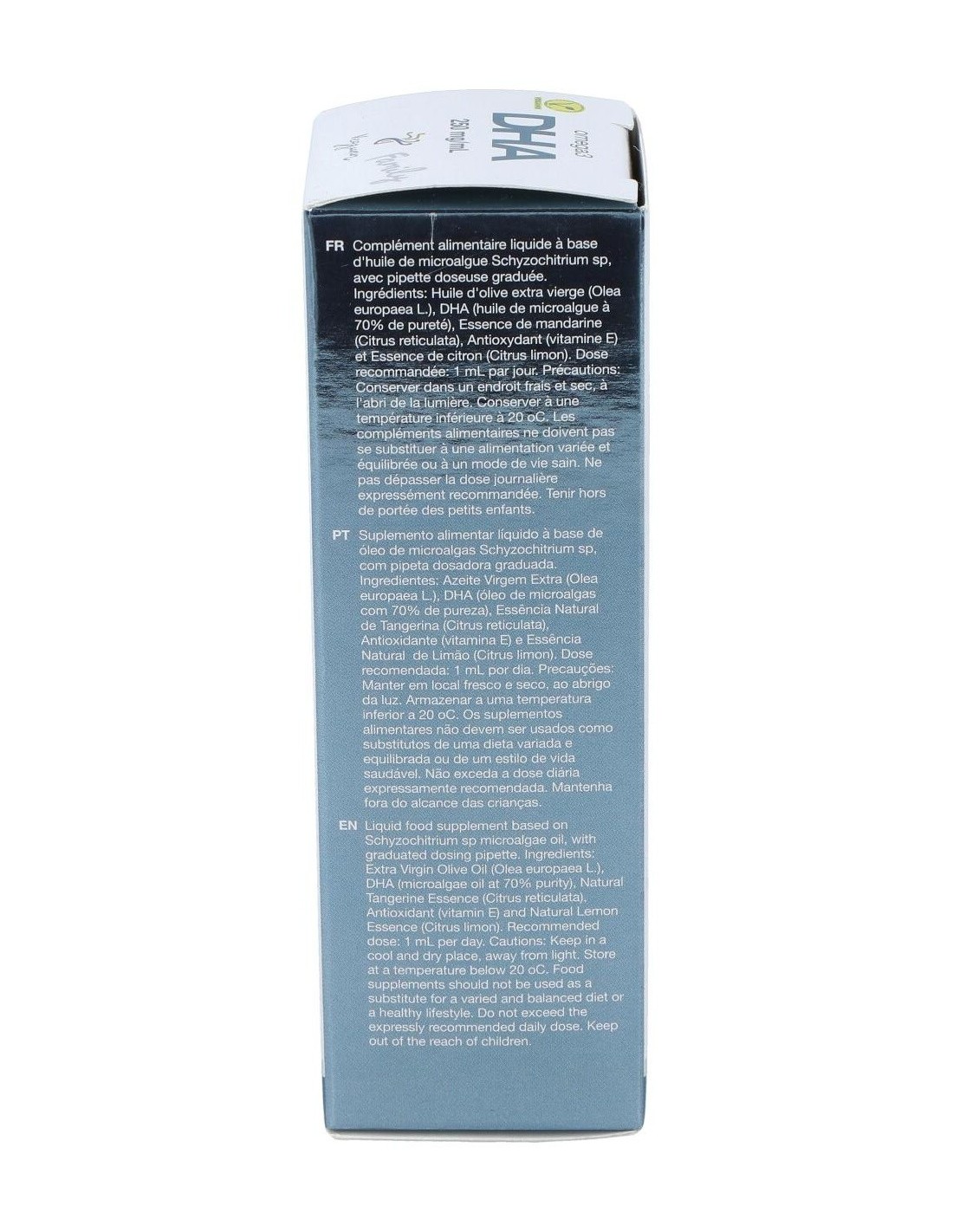 Aceite de microalgas Schizochytrium sp. (70% DHA), aceite de oliva virgen extra AOVE, vitamina E natural, esencias naturales de limón y mandarina.