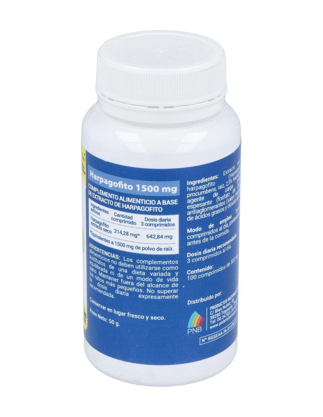 Composición activa por comprimido:214,28 mg de extracto seco de harpagofito (equivalente a 1500 mg de polvo de raiz).Ingredientes:Extracto seco de harpagofito (Harpagophytum procumbens -raíz-) (2,5% harpagósidos), agente de carga (celulosa), espesante (fosfato de calcio), antiaglomerantes (sales magnésicas de ácidos grasos, dióxido de silicio).Modo de empleo:Tomar 3 comprimidos al día, preferentemente antes de las comidas.Presentación:Envase de 100 comprimidos.Recomendaciones y advertencias:No contiene lactosa, gluten ni huevo. No GMO.