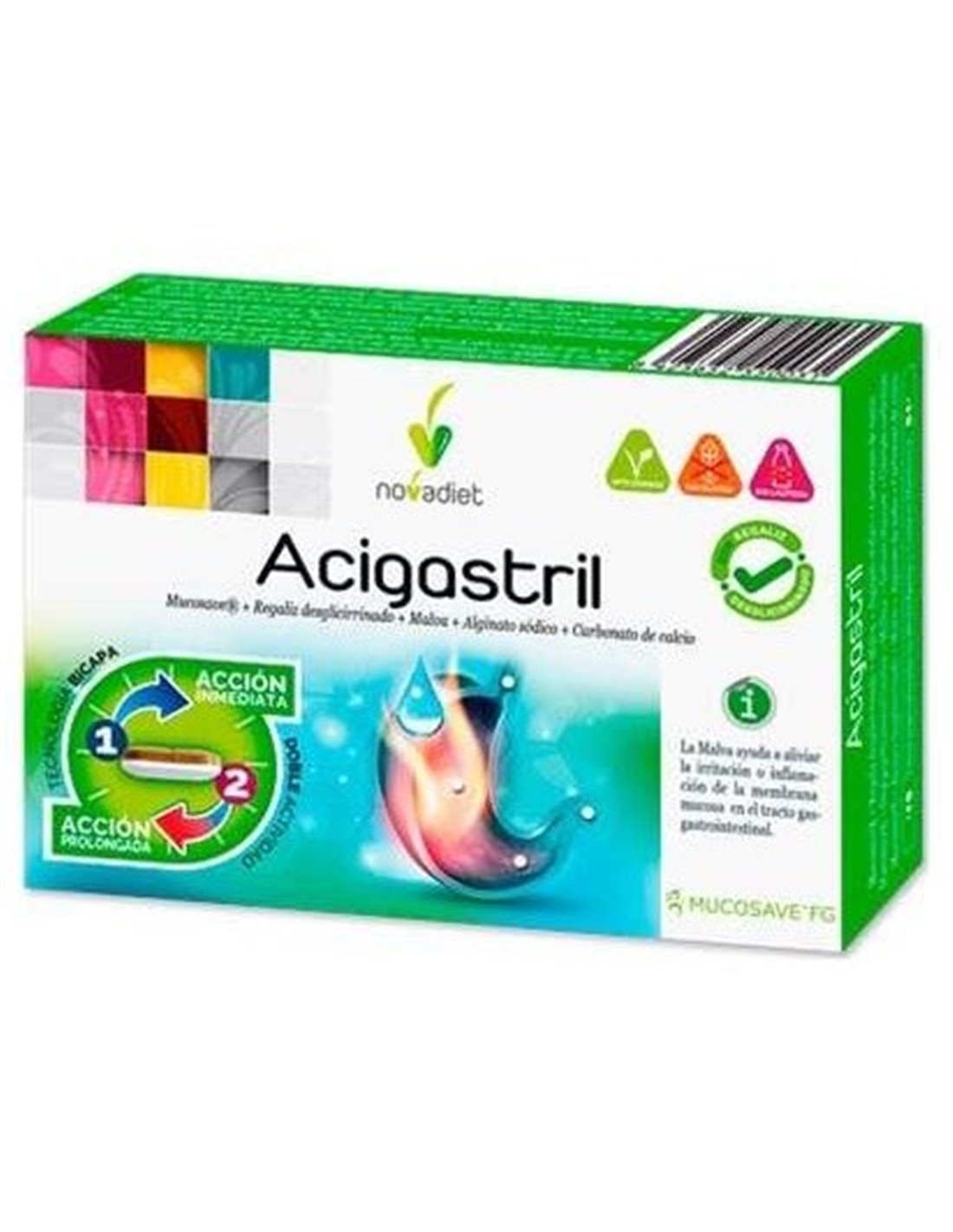 Complemento alimenticio de apoyo al bienestar gástrico, en una fórmula completa y eficaz gracias a su tecnología bicapa:\ La capa blanca aporta Alginato sódico y Carbonato de calcio, dos ingredientes que ayudan de forma rápida en caso de acidez y reflujo tras las comidas.\ La capa marrón contiene Mucosave®, Regaliz desglicirrinado y Malva, ingredientes que ayudan a proteger la mucosa del estómago y apoyan el bienestar gástrico de forma más prolongada en el tiempo.