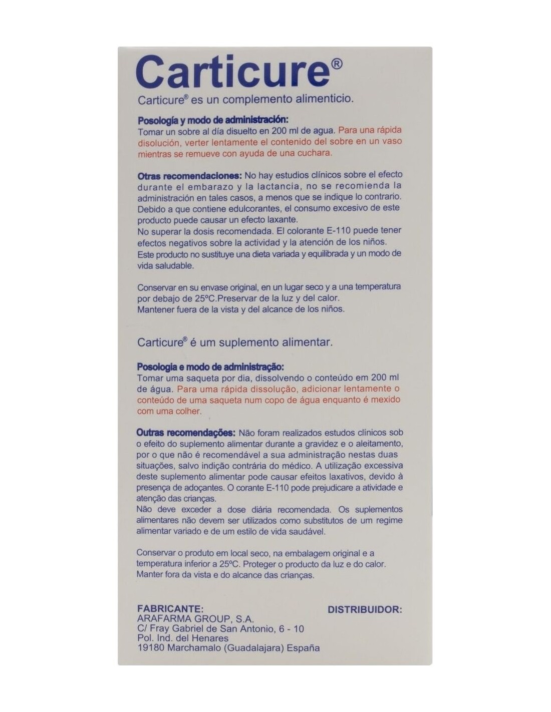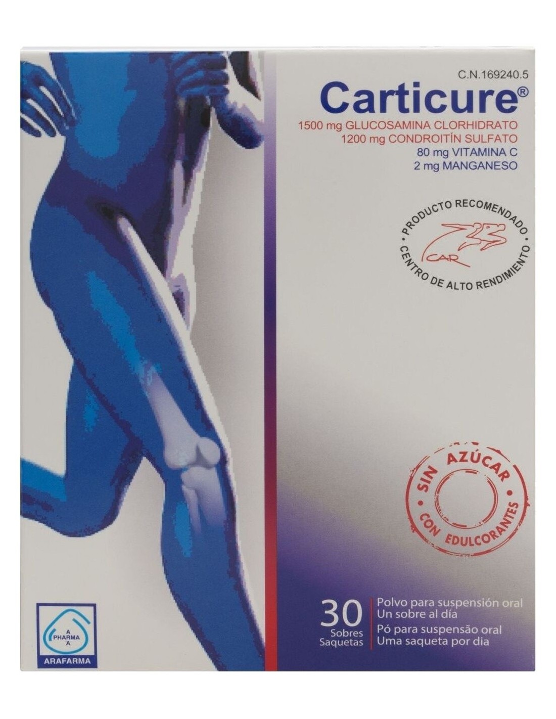 ARAFARMACombina glucosamina y condroitín sulfato, componentes naturales del cartílago. Además, contiene vitamina C y manganeso, en las cantidades diarias recomendadas para ayudar a la normal formación del colágeno y a la protección articular frente al estrés oxidativo.\ \ Carticure solución oral es un producto de la marca Arafarma que viene en presentación de 30 sobres. Cada sobre contiene una fórmula única y exclusiva que combina ingredientes de origen natural para el mantenimiento normal de las articulaciones.\ La fórmula de Carticure solución oral contiene ingredientes naturales que son beneficiosos para el desempeño de las articulaciones en condiciones normales. Entre estos ingredientes se encuentran:\ Colágeno hidrolizado tipo II: Este ingrediente ayuda a mantener la elasticidad de los tejidos conectivos, especialmente en las articulaciones. \ Ácido hialurónico: El ácido hialurónico es un componente natural de los tejidos conectivos y es importante para mantener las articulaciones en condiciones normales. Este ingrediente puede ser útil para mantener la hidratación y la lubricación de las articulaciones.\ Vitamina C: La vitamina C es un antioxidante que ayuda a proteger las células de los daños causados por los radicales libres. Además, la vitamina C es importante para \ dar apoyo a la síntesis del colágeno, que es un componente importante de los tejidos conectivos.\ Manganeso: El manganeso es un mineral importante para la formación de los tejidos conectivos y para la producción de energía en el cuerpo. Ell manganeso es importante para mantener los huesos y articulaciones en condiciones normales.