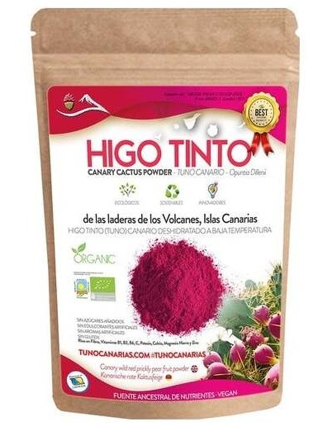 TUNO CANARIASEl Higo Tuno Canario HIGO-TINTO (Opuntia Dillenii) se cosecha en los barrancos y laderas bajo los volcanes. Crece en las hojas de los cactus Nopales traídos a Canarias hace siglos desde América donde ha sido un alimento básico durante miles de años. Es Rico en Fibra, Vitaminas B1, B2, B6, C, Potasio, Calcio, Magnesio Hierro y Zinc que ha sido usado en la medicina popular canaria y los pueblos indígenas americanos durante cientos de años.