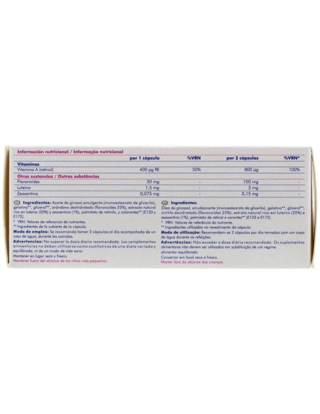 Aceite de girasol, emulgente (monoestearato de glicerilo), gelatina, glicerol, arándano deshidratado (flavonoides 25%), extracto natural rico en luteína (20%) y zeaxantina (1%), palmitato de retinilo, y colorantes (E133 y E172).