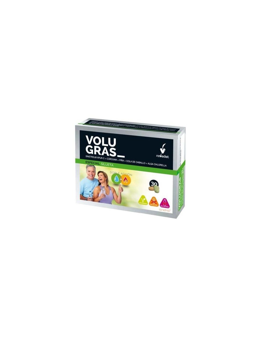 Volugras es un suplemento alimenticio de ayuda en el control del peso en el marco de un estilo de vida saludable, gracias a que su composición incluye Sinetrol® Xpur C, un ingrediente de marca registrada formado por una combinación de\ extractos de pomelo, naranja dulce y guaraná y un concentrado de naranja sanguina. Sus principios activos más importantes son polifenoles procedentes de los cítricos y cafeína procedente del guaraná, que cuentan con estudios clínicos que avalan su mecanismo de acción y sus beneficios en la composición corporal, en relación a la reducción de masa grasa sin pérdida de masa muscular. También aporta otros ingredientes como Cola de caballo, una planta con actividad diurética y remineralizante. Apto para veganos.