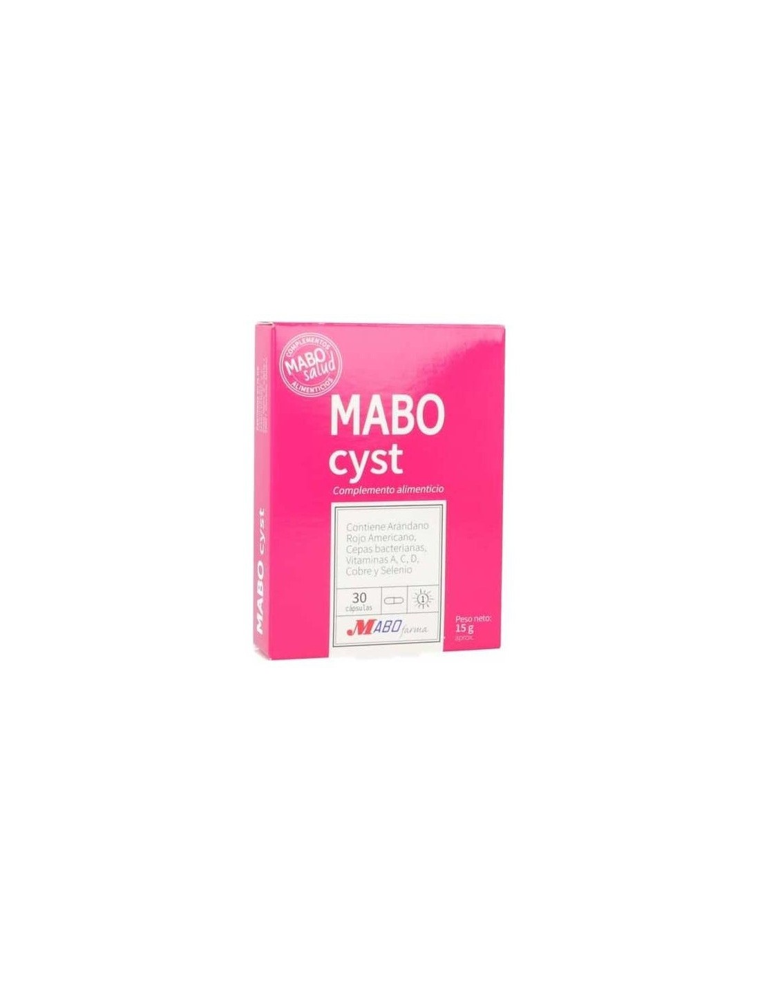 MABOcyst es un complemento alimenticio que contiene Arándano Rojo Americano, Probióticos específicos para la flora vaginal, Vitaminas A, C y D, Cobre y Selenio, componentes que en sinergia podrían ayudar al normal funcionamiento del sistema urinario. Recomendado para mujeres que busquen un aporte suplementario de vitaminas y probióticos para el sistema urinario.