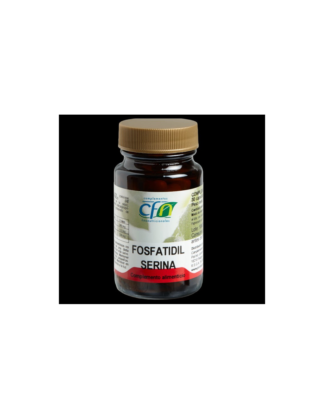 La principal fuente natural de Fosfaitidilserina es la lecitina de soja, que se ha de concentrar para obtener unos niveles significativos de fosfolípidos.Composición por cápsula:334 mg de concentrado de fosfatidil serina que contiene 205 mg de complejo de fosfolípidos de la soja (67 mg de fosfatidil serina, 50 mg de fosfatidilcolina, 43 mg de fosfatidiletanolamina y 20 mg de fosfatidilnostrol) y 185 mg de ácidos grasos (110 mg de ácido linoleico, 10 mg de ácido linolénico, 20 mg de ácido oleico, 10 mg de ácido esteárico, 35 mg de ácido palmítico, 15 mg de fósforo orgánico y 5 mg de potasio orgánico). Modo de empleo:Tomar de 1 a 2 cápsulas al día. Presentación:Bote de 30 cápsulas.