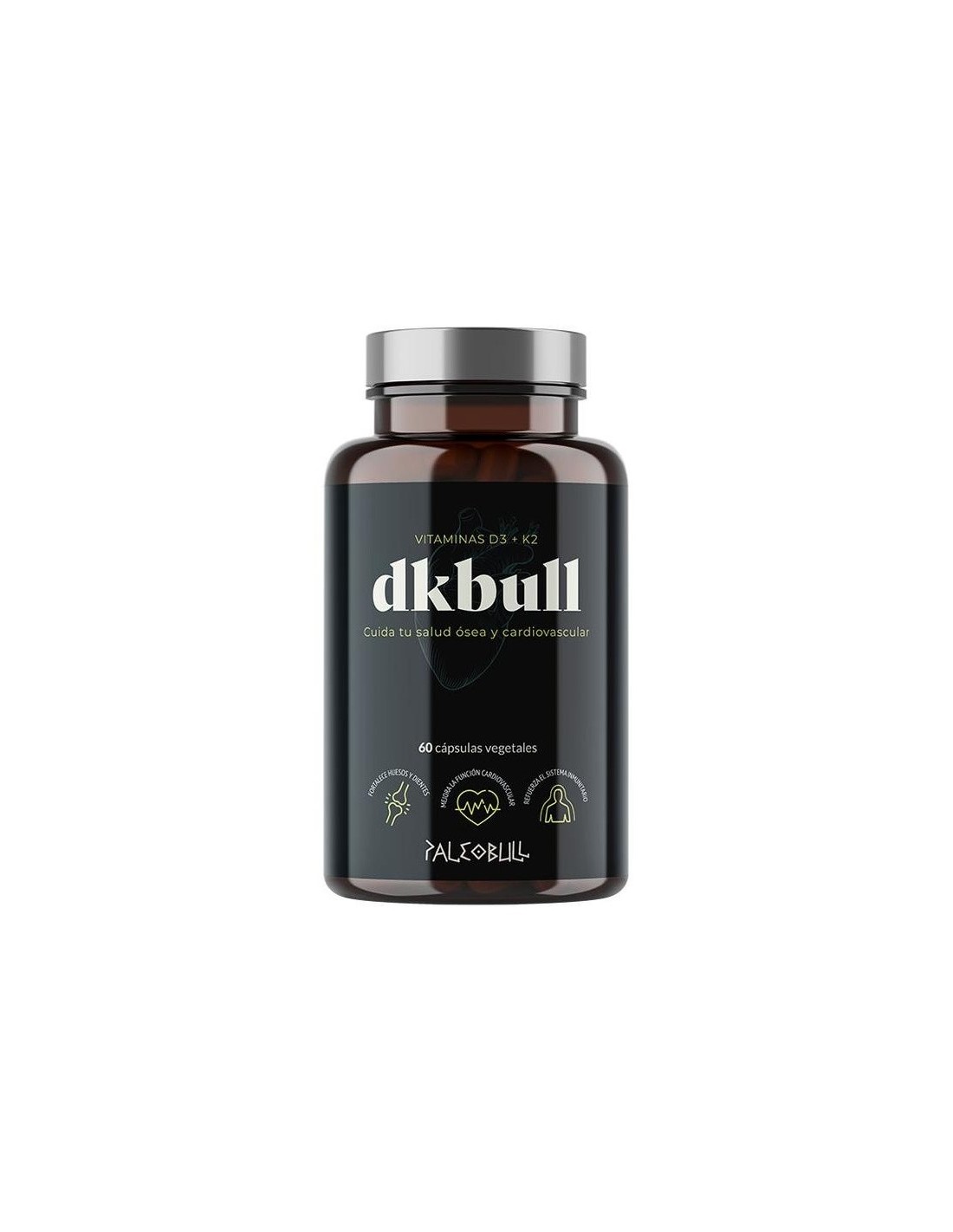DKbull es un suplemento elaborado con vitaminas D3 (colecalciferol) y K2 (menaquinona MK-7) que favorece el cuidado de tu salud ósea y cardiovascular. Combina a la perfección los efectos sinérgicos de las vitaminas D3 y K2. Por un lado, la vitamina D3 aumenta la absorción del calcio. Por otro lado, la vitamina K2 ayuda a que ese calcio llegue a los huesos y evita que se deposite en las arterias.La vitamina D tiene un papel fundamental en numerosos procesos fisiológicos, entre los que destaca su implicación en la salud ósea. El cuerpo necesita vitamina D para absorber el calcio. Una carencia de vitamina D puede aumentar el riesgo de padecer osteoporosis o sufrir fracturas óseas.Composición activa por cápsula: 50 mcg de vitamina D3 (2.000 UI). 100 mcg de vitamina K2. Ingredientes:Harina de arroz, cápsula vegetal (hidroxipropilmetilcelulosa), vitamina K2 (menaquinona MK-7) y vitamina D3 (colecalciferol).Modo de empleo:Tomar 1 cápsula, preferiblemente por la mañana con agua.Presentación:Envase de 60 cápsulas vegetales.Recomendaciones y advertencias:No contiene gluten ni lactosa. No GMO.
