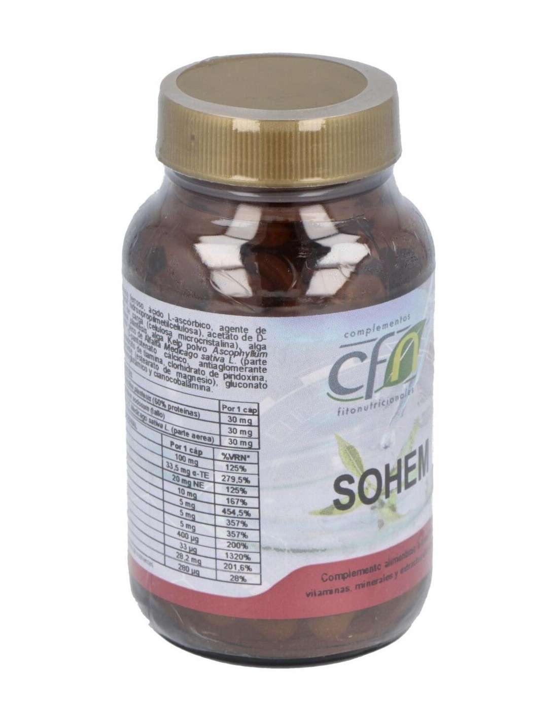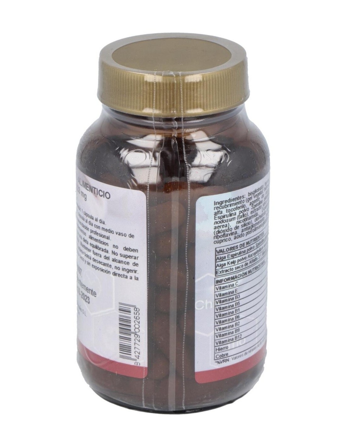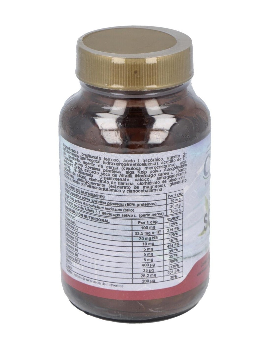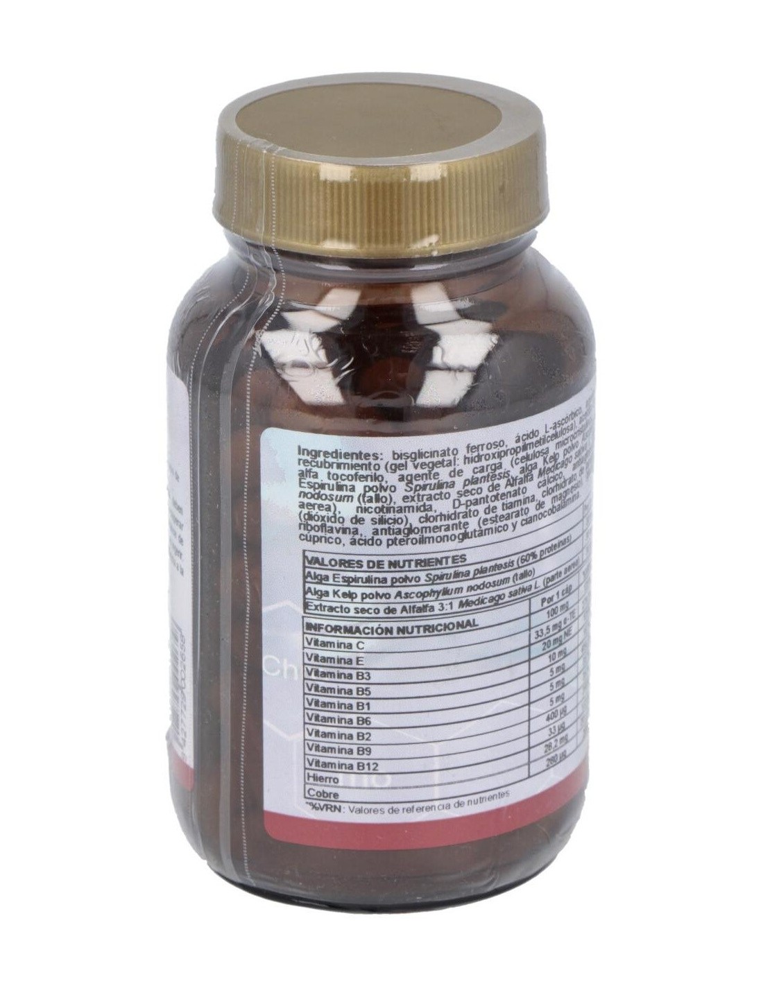 Este producto resulta idoneo para el tratamiento de estados anémicos, tercera edad, mujeres gestantes, deportistas, convalecencias, personas con una precaria alimentación deficitaria en hierro y vitamina C. Composición por capsula: 30 mg de hierro aminoquelado (equivalente a 150 mg de hierro elemental). 5 mg de vitamina B1. 5 mg de bitamina B2. 20 mg de vitamina B3. 10 mg de vitamina B5. 5 mg de vitamina B6. 100 mg de vitamina C. 100 mcg de vitamina B12. 800 mcg de ácido fólico. 50 UI de vitamina E (100 mg alta tocoferol acetato). 1 mg de cobre aminoquelado (equivalente a 10 mg de cobre elemental). 30 mg de extracto 5:1 de alfalfa. 30 mg de espirulina máxima. 30 mg de algas kelp. Modo de empleo:Tomar de 1 a 2 cápsulas al día. Presentación:Bote de 60 cápsulas.