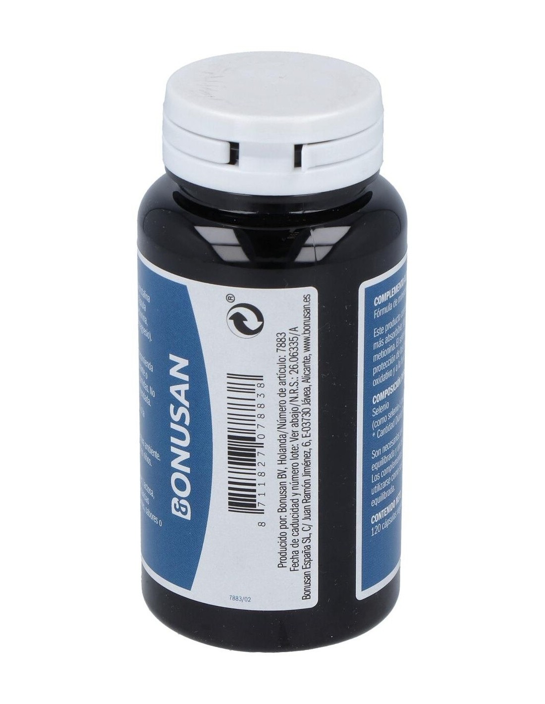 El selenio tiene un efecto antioxidante potente y proporciona una protección eficaz contra los radicales libres. También estimula el sistema inmunológico y la función de la glándula tiroides. Para los fines de este producto, Bonusan utiliza especialmente la forma única de selenio natural seleniometionina.Esta sustancia activa garantiza una mayor disponibilidad y una absorción óptima en su cuerpo de los principios activos. Para obtener los mejores resultados, este producto debe utilizarse diariamente. De esta manera, se sentirá rápidamente revitalizado y en plena forma, lo que le permitirá disfrutar de la vida al máximo, una vez más. Composición activa por cápsula:200 mcg de selenio (selenio-L-metionina). Ingredientes:Agente de carga (celulosa microcristalina), pared de la cápsula (hidroxipropilmetilcelulosa), selenio-L-metionina, antiaglomerante (sales magnésicas de ácidos grasos).Modo de empleo:Tomar 1 cápsula al día con la comida o inmediatamente después de ella. Presentación: Envase de 120 cápsulas.Recomendaciones y advertencias:No contiene colorantes, conservantes, levadura, maíz, sacarosa añadida, aromatizantes y fragancias sintéticas.
