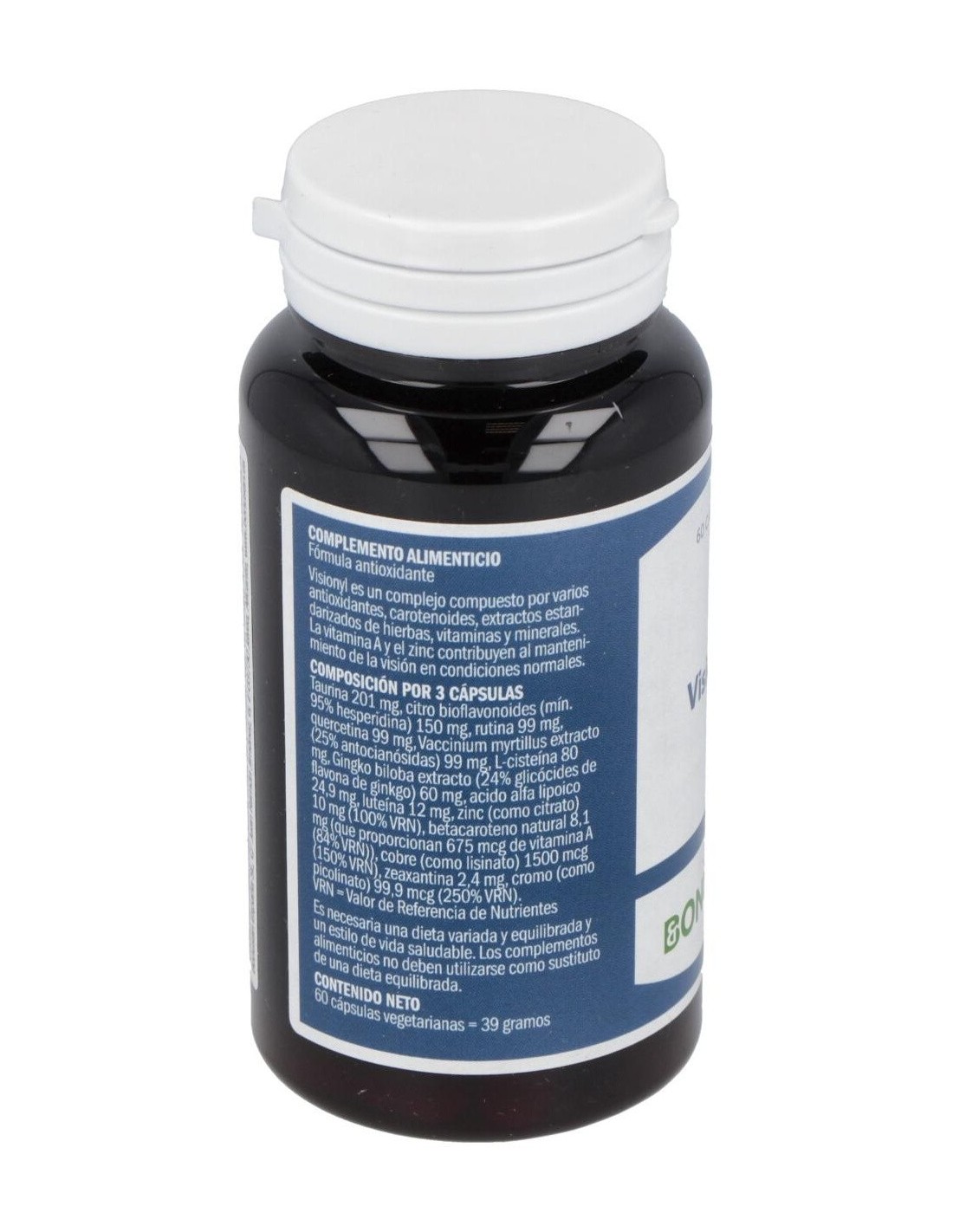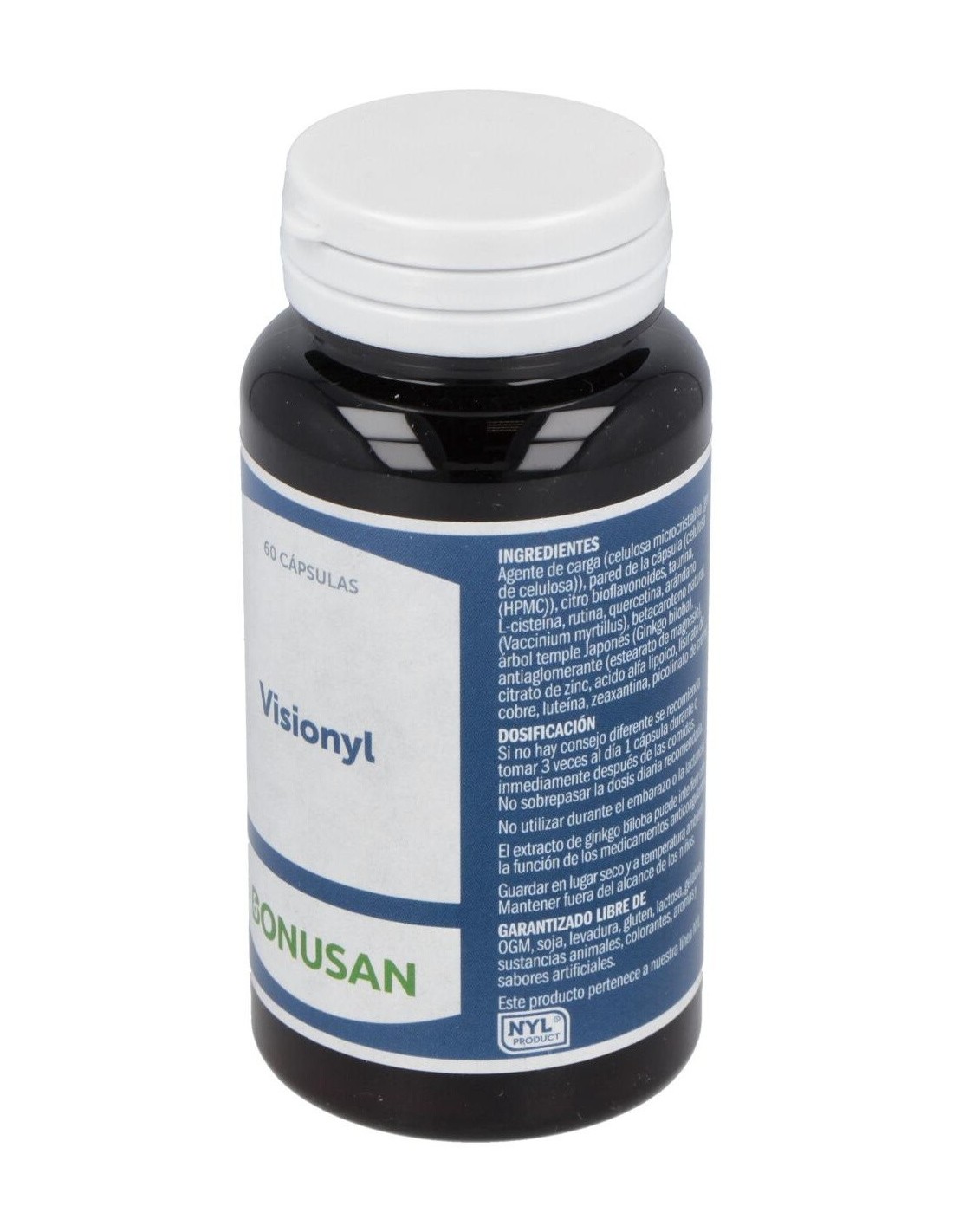 El cuerpo humano no es capaz de producir luteína y zeaxantina, parte de las manchas amarillas de los ojos, por lo que Bonusan ha desarrollado especialmente Visionyl. El producto contiene luteína. El efecto antioxidante de los arándanos ayuda a mantener la salud de los ojos y una buena vista. El Ginkgo también apoya a la visión. Todos nuestros productos de la línea NYL son óptimas fórmulas combinadas con un potente efecto adicional, resultando en una mejor facilidad de uso. Utilice Visionyl diariamente, sobre todo cuando sus ojos empiecen a envejecer. Composición por dosis diaria recomendada (3 cápsulas):