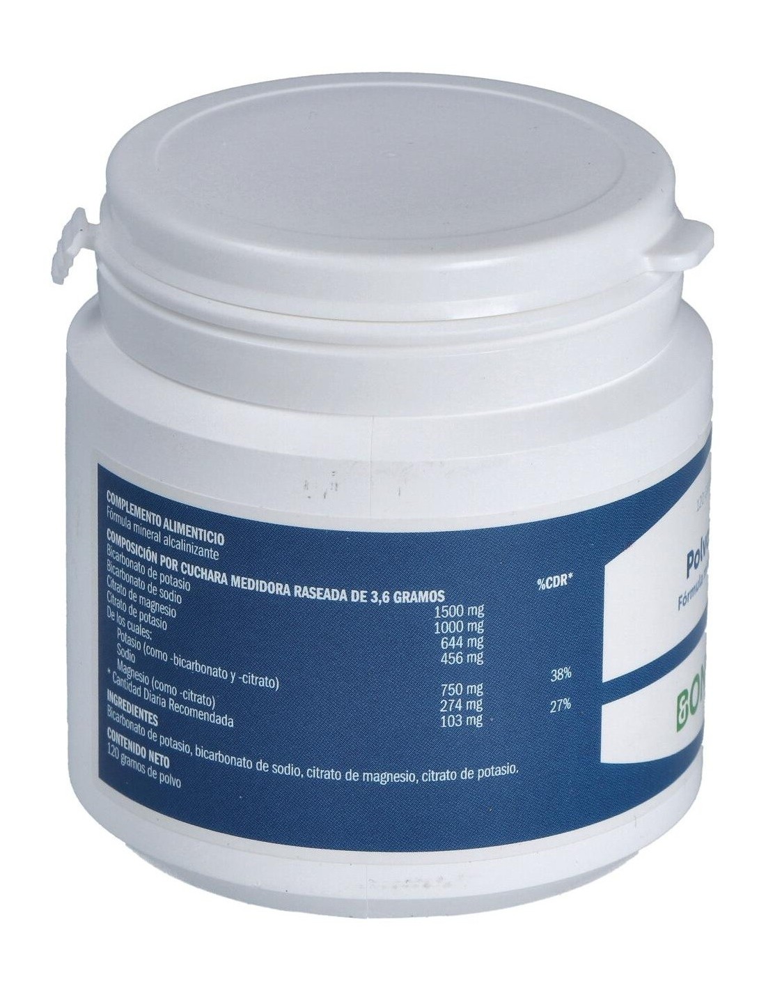 Por 1 cucharada: Bicarbonato de potasio (1500 mg), Bicarbonato de Sodio (1000 mg), Potasio (750 mg), Citrato de Magnesio (644 mg), Citrato de Potasio (456 mg), Sodio (274 mg), Magnesio (103 mg).