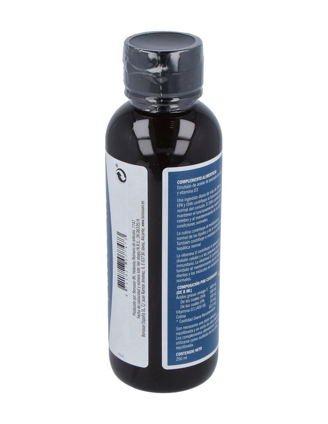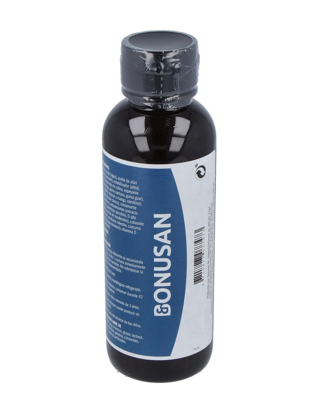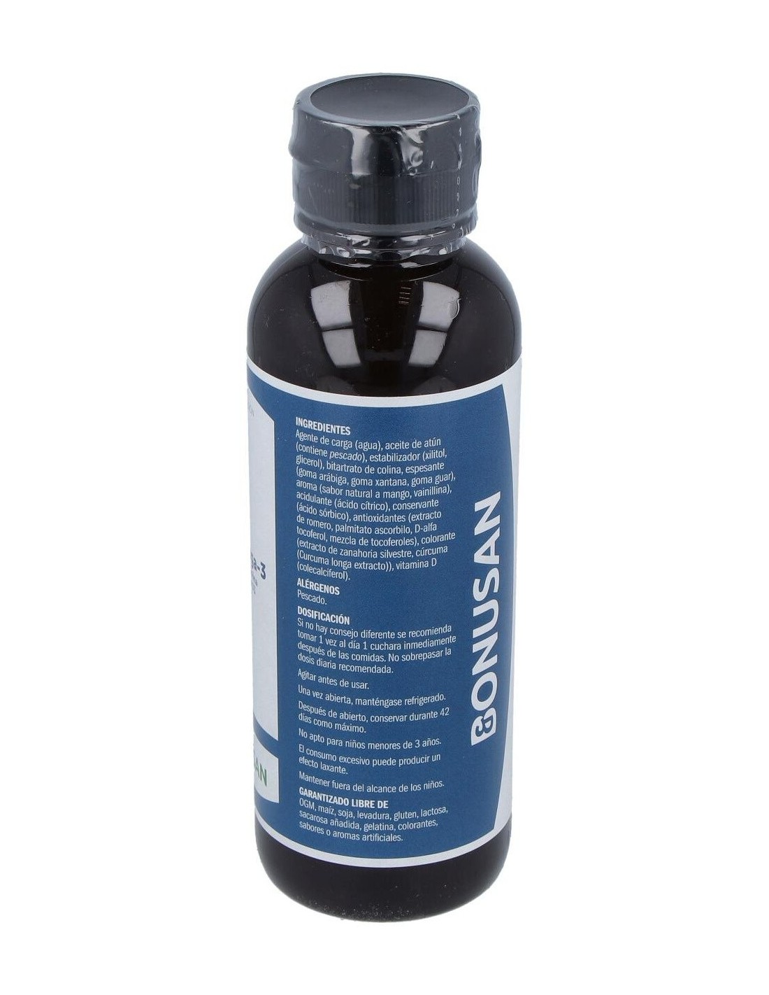 No contiene maíz, levadura, sacarosa añadida, gelatina, colorantes, aromas y sabores artificiales. Contiene pescado. El consumo excesivo puede producir un efecto laxante. No apto para niños menores de 3 años.