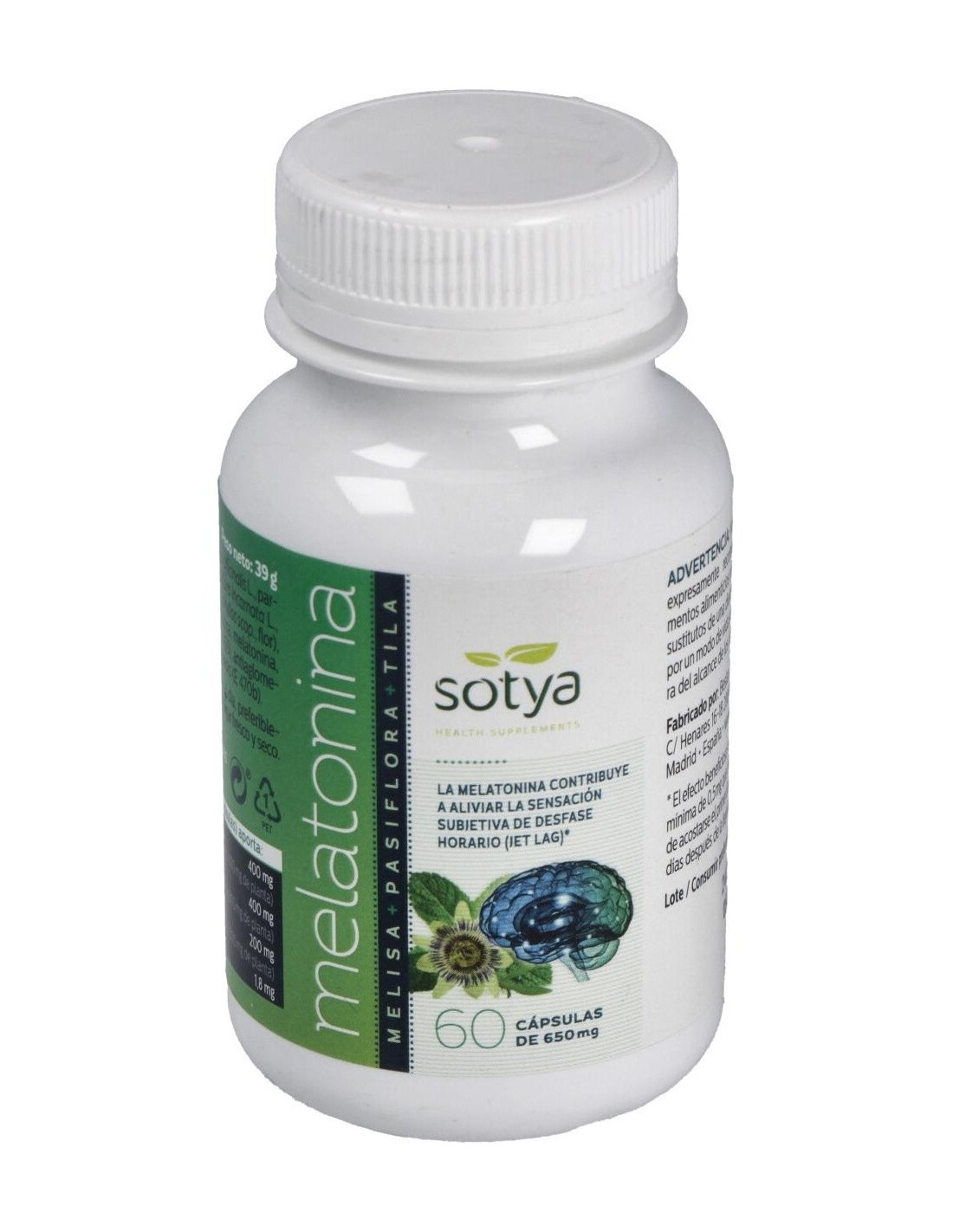 La Melatonina Melisa+Pasiflora+Tila 650Mg Cáps.60U de Sotya es un suplemento natural para adultos que ayuda a favorecer el descanso nocturno mediante una combinación de ingredientes tradicionales.