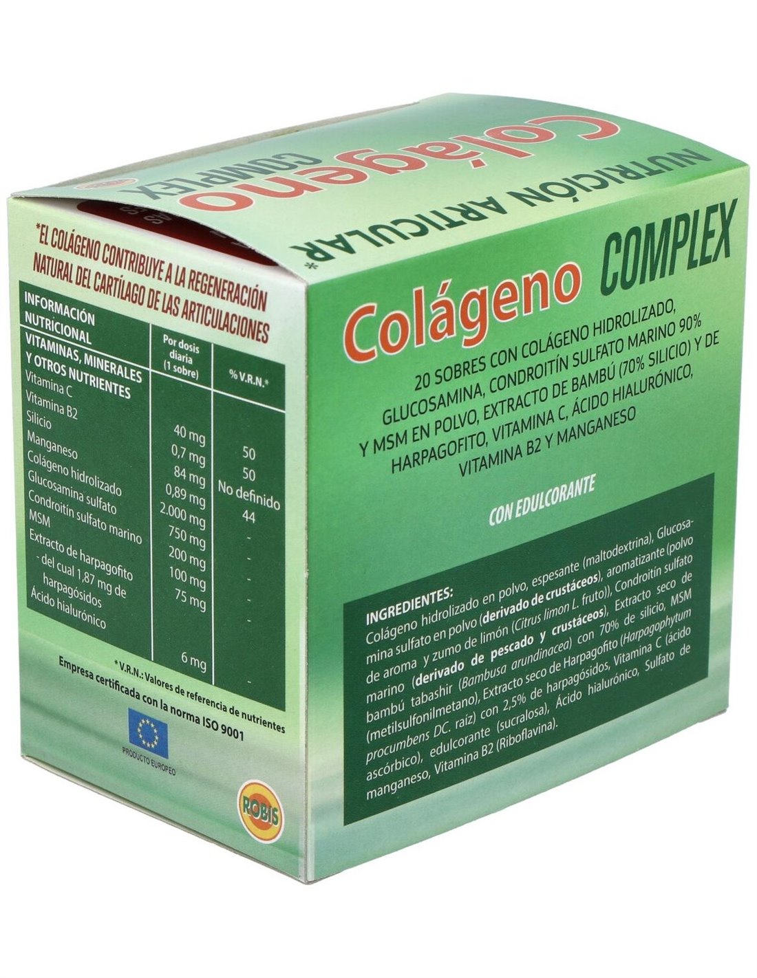 Colageno Complex 20Sbrs. de Robis es un suplemento diseñado para personas interesadas en apoyar la salud de su piel, articulaciones y tejidos conectivos mediante una fórmula que combina ingredientes seleccionados. Es adecuado para quienes buscan complementar su dieta con colágeno en una presentación práctica y dosificada.