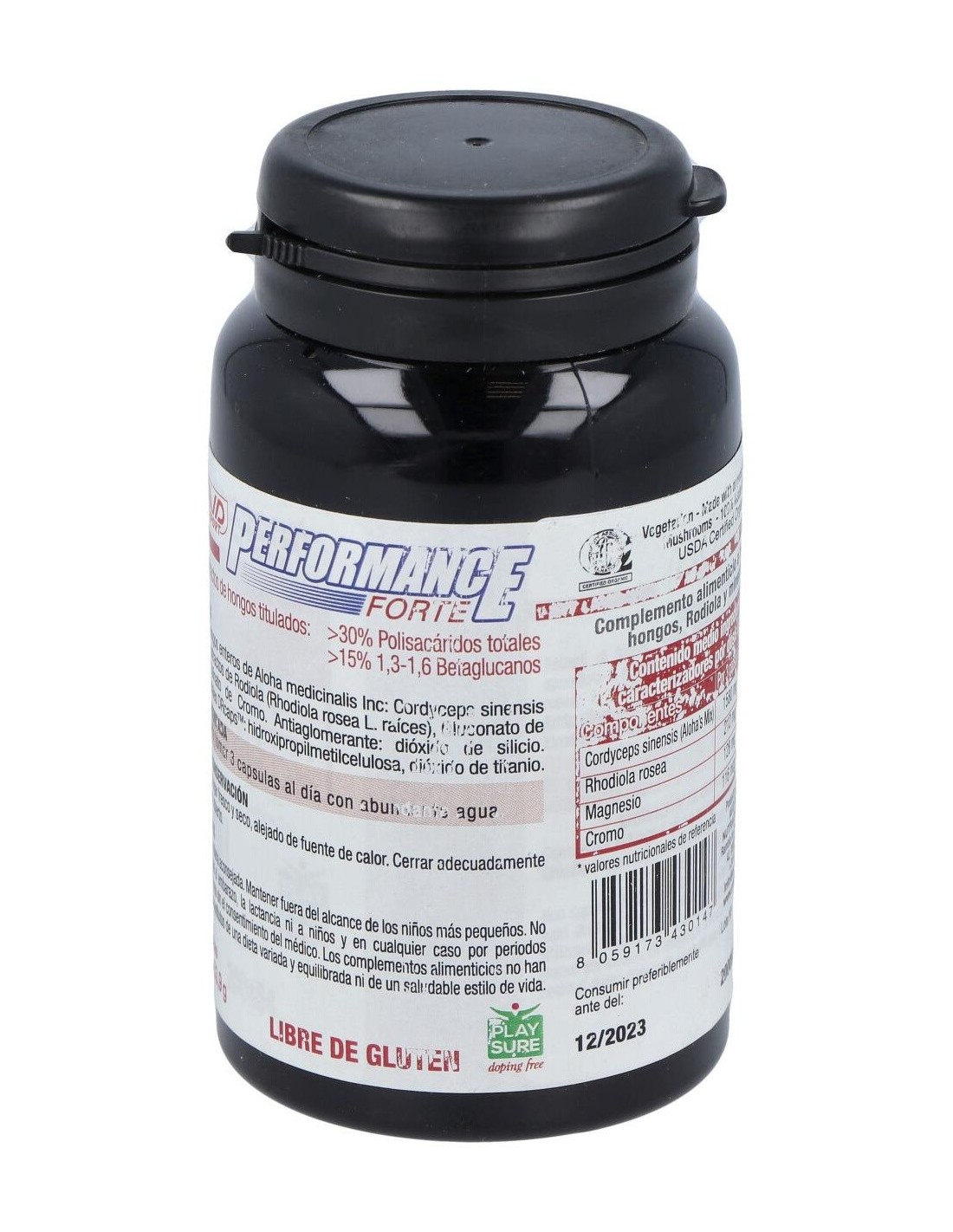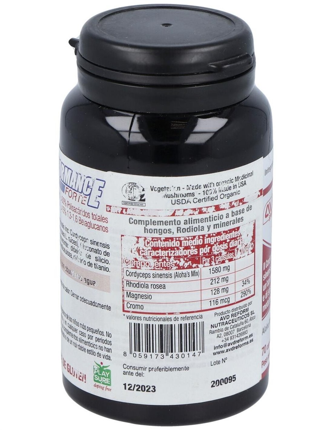 Extractos de hongos enteros de Aloha medicinalis Inc: Cordyceps sinensis (Alohas mix): extractos de Rodiola (Rhodiola rosea L. raíces), Gluconato de Magnesio, Picolinato de Cromo. Antiaglomerante: dióxido de silicio. Càpsulas vegetales DRcapsTM: hidroxipropilmetilcelulosa, dióxido de titanio.