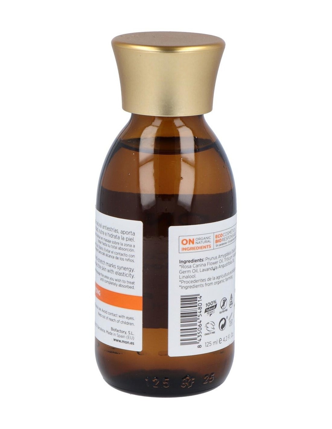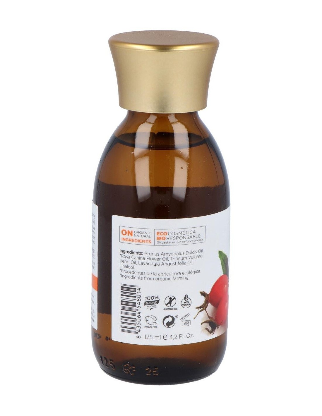 PRUNUS AMYGDALUS DULCIS OIL, ROSA CANINA FRUIT OIL*, TRITICUM VULGARE GERM OIL, LAVANDULA ANGUSTIFOLIA OIL, LINALOOL. * Ingrediente procedente de la agricultura ecológica.