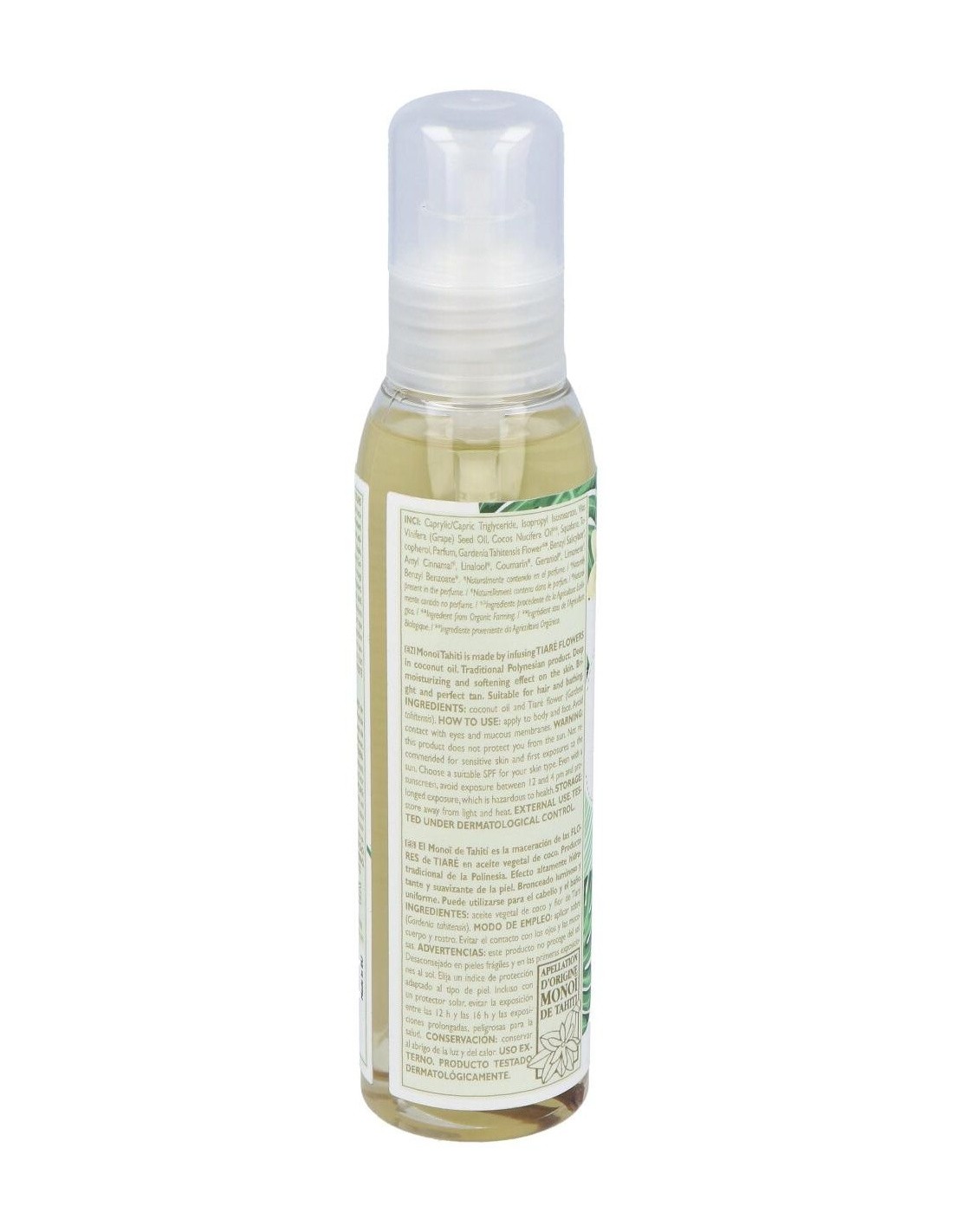 Ingredientes:Ésteres de ácidos grasos (efecto seco), aceite de vid roja, aceite de coco*, esqualeno, tocopherol (vitamina- e natural), aroma de flor de Tiaré (Gardenia Tahitensis). *ingredientes procedentes de la agricultura ecológica. Modo de empleo:Aplicar sobre cuerpo y rostro. Evitar el contacto con los ojos y las mucosas.Presentación:Frasco con dosificador de 100 ml.