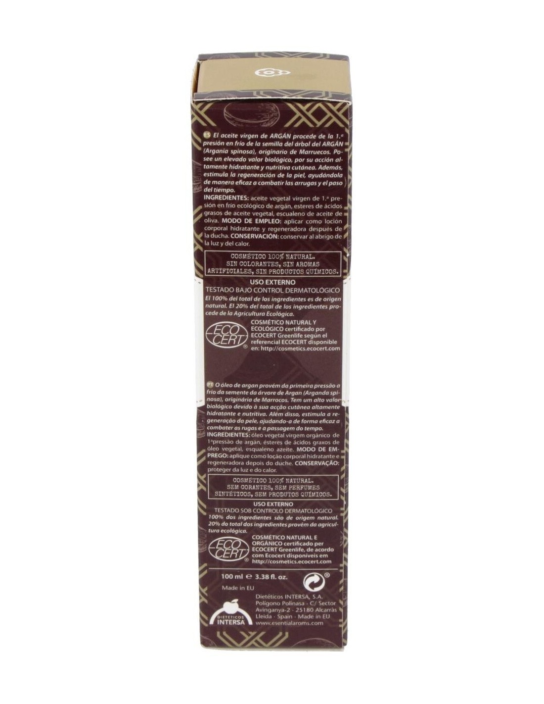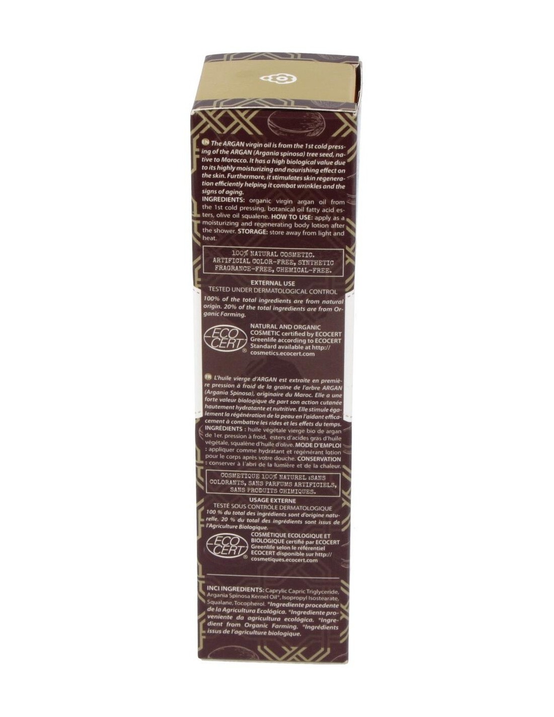 Ingredientes (INCI):Caprylic Capric Triglyceride, Argania Spinosa Kernel Oil*, Isopropyl Isostearate, Squalane, Tocophero|**. (*) Ingrediente procedente de la Agricultura Ecológica. (**) El tocopherol es vitamina E y es de procedencia natural.Modo de empleo:Aplicar como loción corporal hidratante y regeneradora, después de la ducha.Presentación:Envase de 100 ml.Recomendaciones y advertencias:No contiene colorantes, aromas artificiales ni productos químicos.