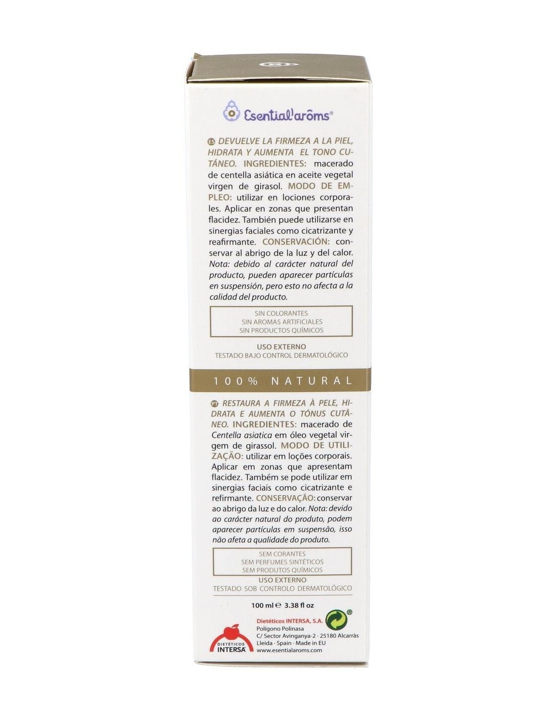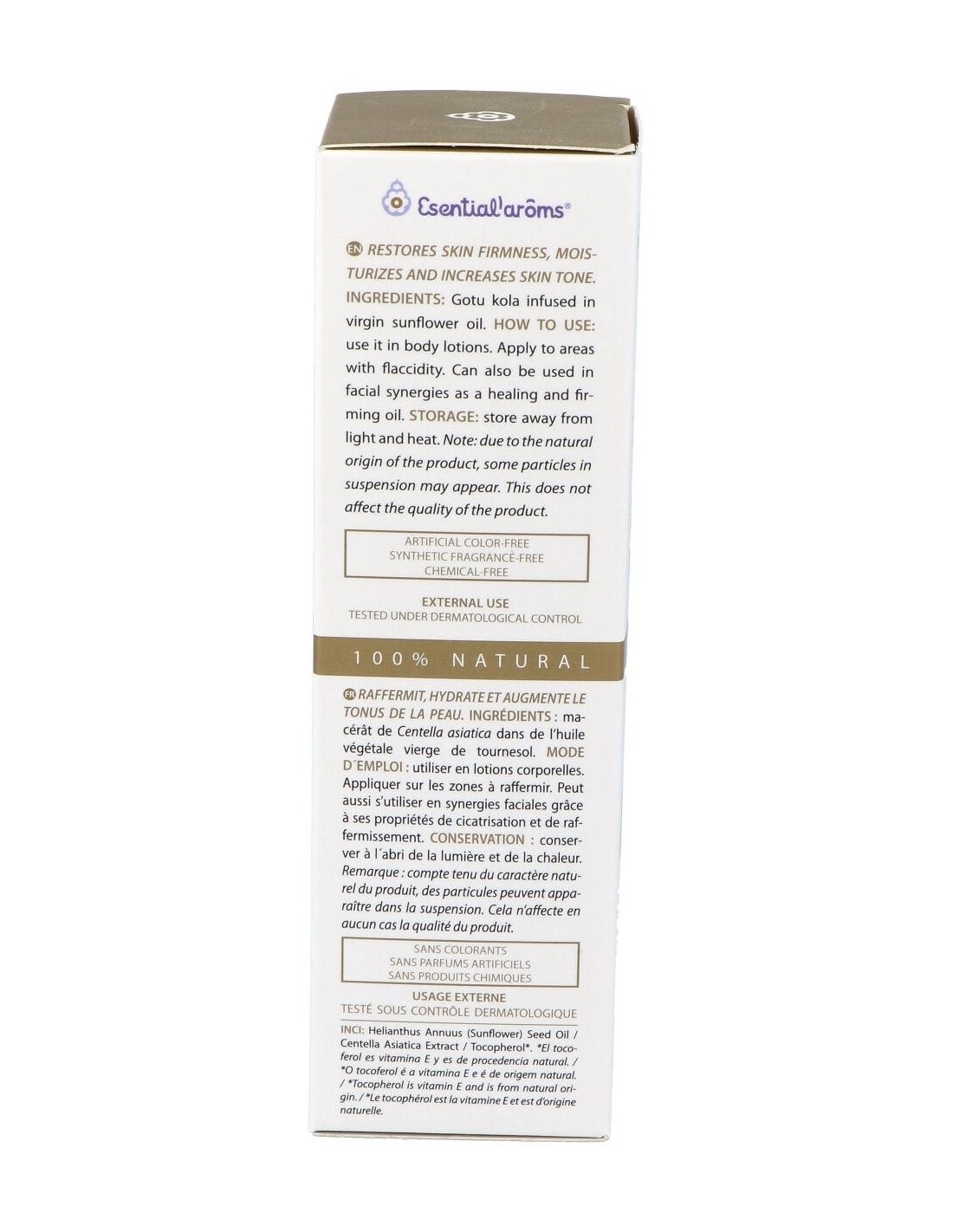 Ingredientes:Macerado de centella asiática en aceite vegetal virgen de girasol.Ingredientes (INCI):Helianthus Annus, Sunflower Seed Oil, Centella Asiática Extract, Tocopherol. (*) Tocoferol es vitamina E y es de procedencia natural.Modo de empleo:Puede aplicarse directamente después de la ducha diaria en masaje de zonas flácidas y con celulitis. Masajear previamente la zona con un guante de crin y luego aplicar el producto en masajes circulares.Presentación:Envase de 100 ml.Recomendaciones y advertencias:No contiene colorantes, aromas artificiales ni productos químicos. Uso externo, no utilizar durante el embarazo y la lactancia.