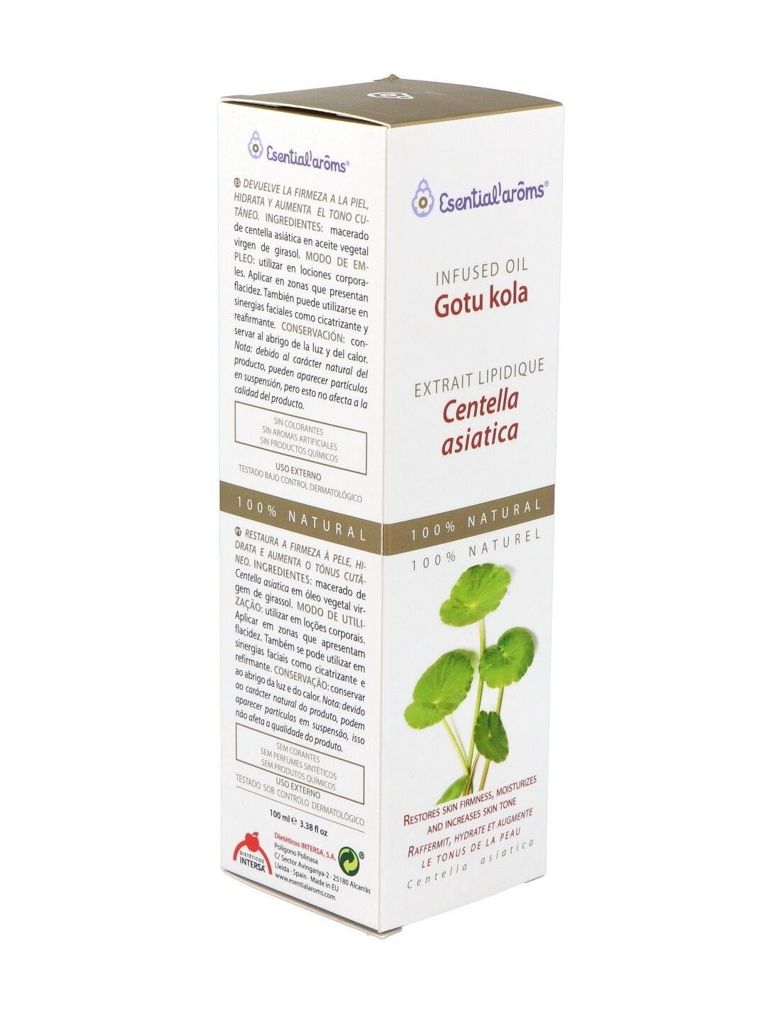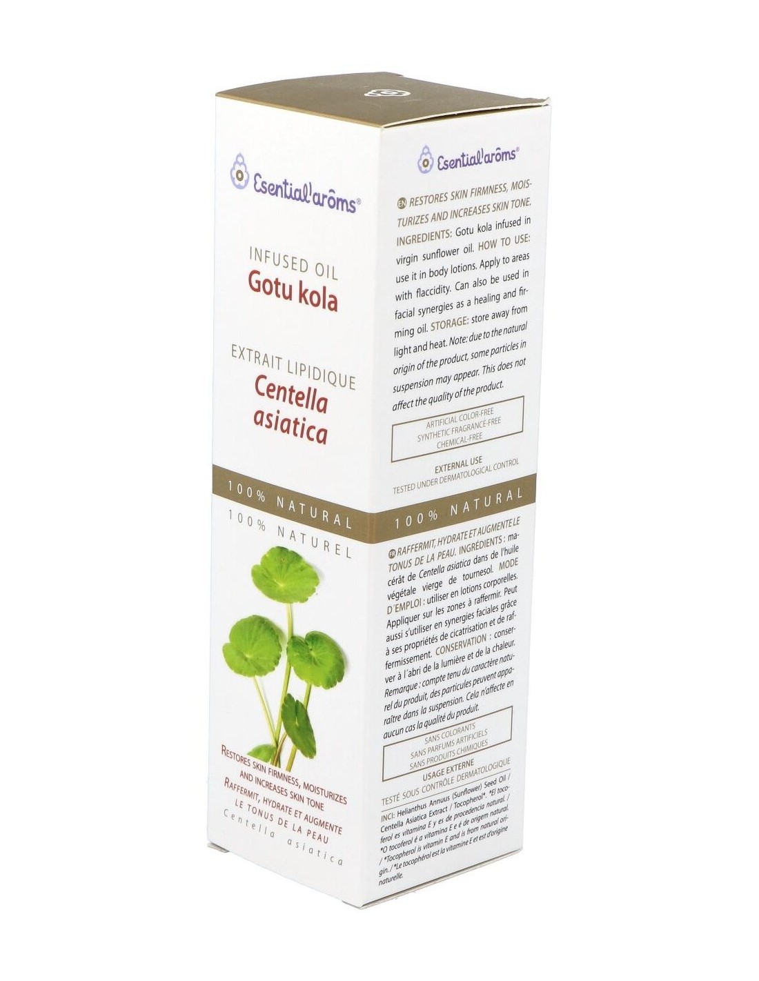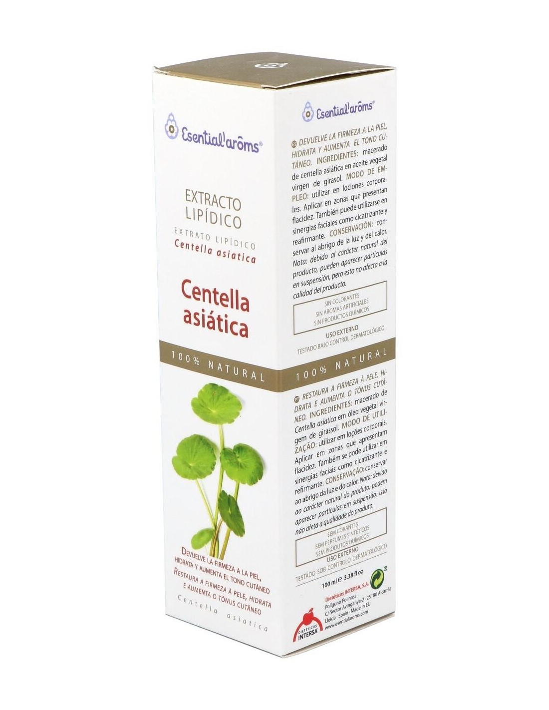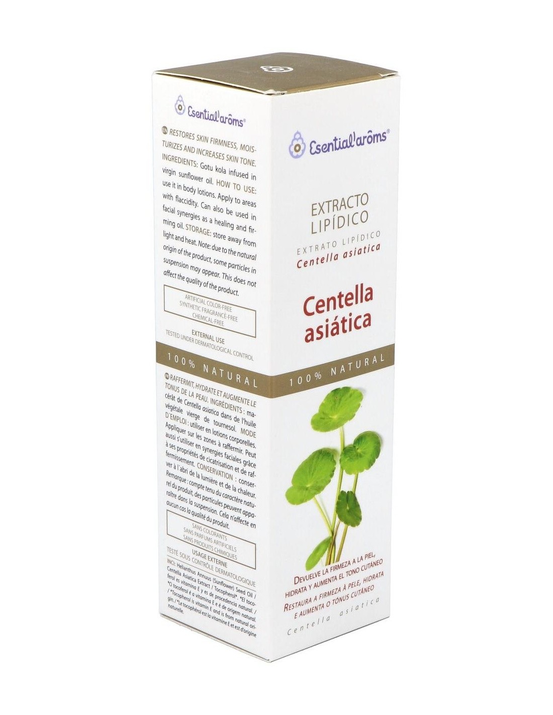 El extracto Lipídico de Centella Asiática de Esential'Aroms es un producto obtenido a través de la maceración de la planta. La centella asiática se ha utilizado tradicionalmente por sus propiedades regeneradoras, cicatrizantes y restauradoras del tejido conjuntivo. Conviene a las pieles con flacidez y celulitis, ayuda a que los tejidos retomen su forma. Se utiliza también en tratamientos faciales antiarrugas.Propiedades e indicaciones: