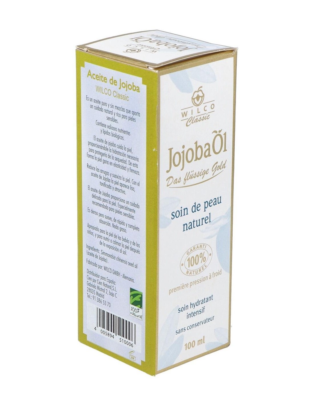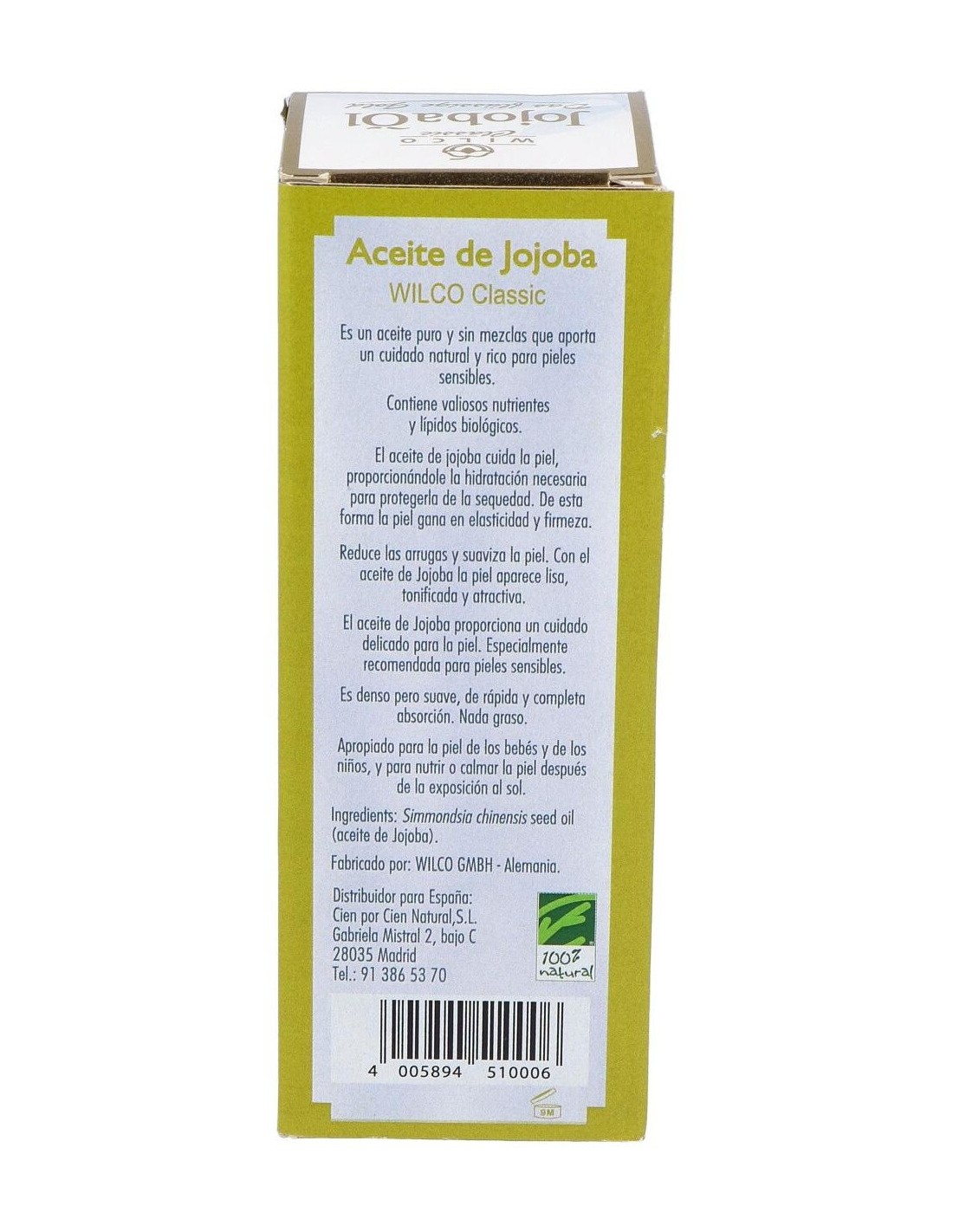 El Aceite de Jojoba Wilco Classic nutre la piel, la refresca y la protege del ataque medio ambiental. Contiene lípidos y vitamina E naturales, así como otros minerales. Suaviza y alisa la piel, haciéndola más flexible, y reduce las líneas de expresión, rejuveneciéndola. En su compleja composición hay un 96% de ceramida, lo que hace que resulte extremadamente estable al calor y a la oxidación conservándose perfectamente con el paso del tiempo y manteniendo íntegras sus propiedades. Estas ceramidas son muy similares a las de la piel y actúan allí donde se necesita, ejerciendo una profunda hidratación y reestructurando el equilibrio graso de la piel. Composición:100% aceite puro de jojoba. Presentación:Frasco de 100 ml.