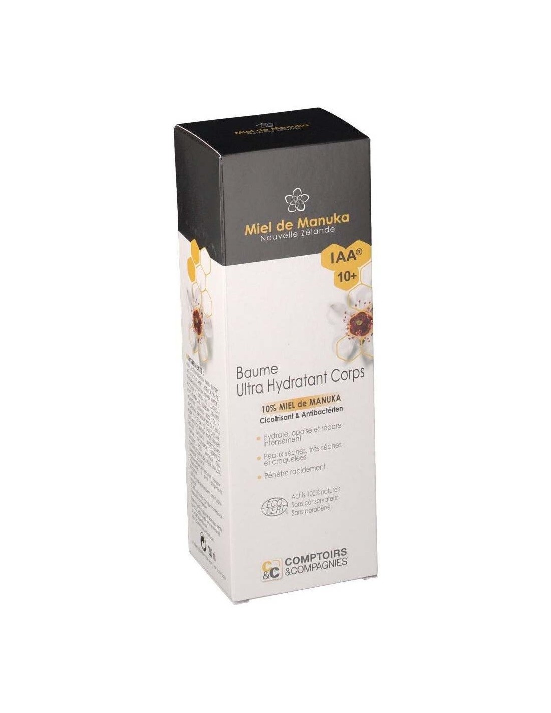 Bálsamo corporal ultrahidratante compuesto por un 10% de miel de manuka IAA10 + que hidrata intensamente, calma y repara la piel seca, muy seca y sensibilizada. Enriquecida con manteca de karité y aceite de macadamia, la piel se calma y vuelve a ser flexible y suave. Certificado ECOCERT.