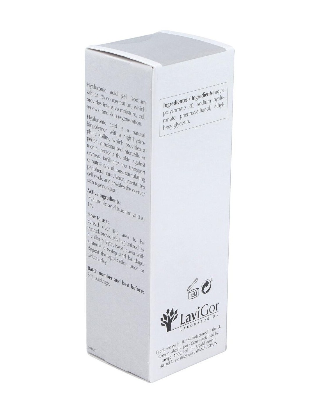Gel de ácido hialurónico al 1% que proporciona hidratación intensiva, renovación celular y regeneración cutánea. El ácido hialurónico es un biopolímero natural, con una elevada capacidad hidrofílica, que proporciona un medio intercelular perfectamente hidratado, protege la piel contra la sequedad, facilita el transporte de nutrientes e iones, estimulando la circulación periférica, revitaliza el ciclo celular y posibilita una correcta regeneración cutánea.