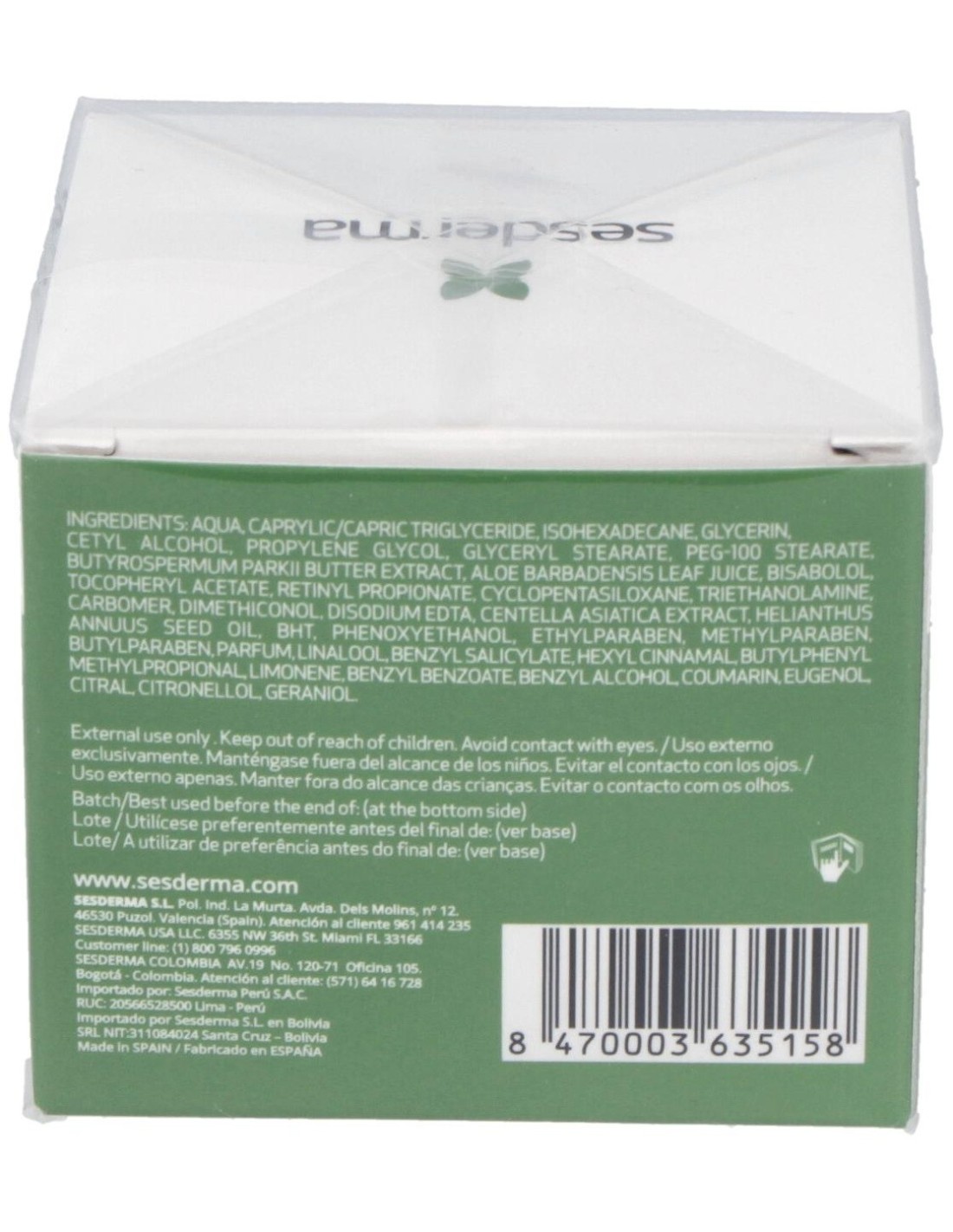5% aloe vera, manteca de karité, Extracto De Camomila, extracto de centella asiática.