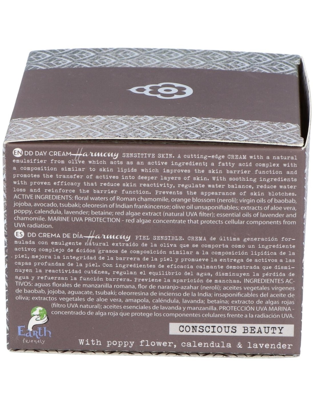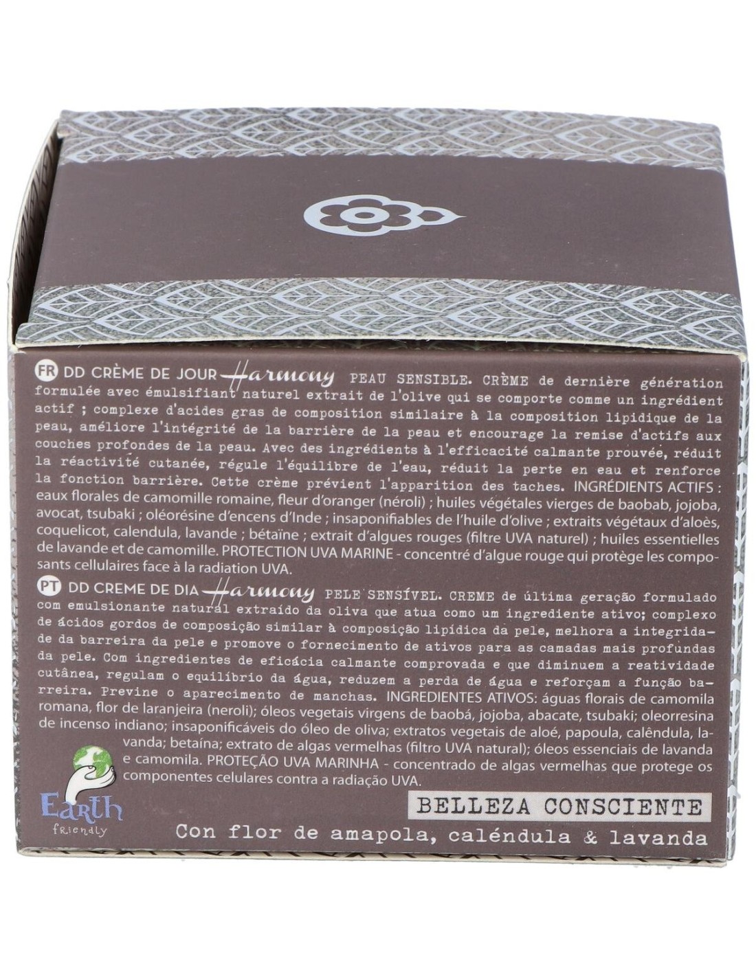 El concepto DD se atribuye a la propiedad de aumentar la capacidad defensiva de la piel, a través de la absorción de principios activos vegetales que potencian la cohesión celular y refuerzan la función barrera a través de un efecto protector del estrés oxidativo, efecto antiarrugas y protección antimanchas. Las crema DD de última generación están formuladas con un emulsionante natural extraído de la oliva, insaponificables del aceite de oliva, aceite de tsubaki o camelia japónica, betaína de acción antimanchas y protección natural UVA-Marina, procedente de algas rojas. DD Crema Harmony incluye en su composición, los extractos de amapola, caléndula, lavanda; aceites vegetales vírgenes de baobab, jojoba y aguacate; y aguas florales de manzanilla y neroli. Activos que proporcionan propiedades equilibrantes y calmantes de la piel sensible.Modo de empleo:Realiza la limpieza de la piel con tu CleanTonic adecuado a tu tipo de piel. Después aplica la DD Crema Harmony extendiendo el producto hasta su total absorción. Presentación:Tarro de 50 ml.