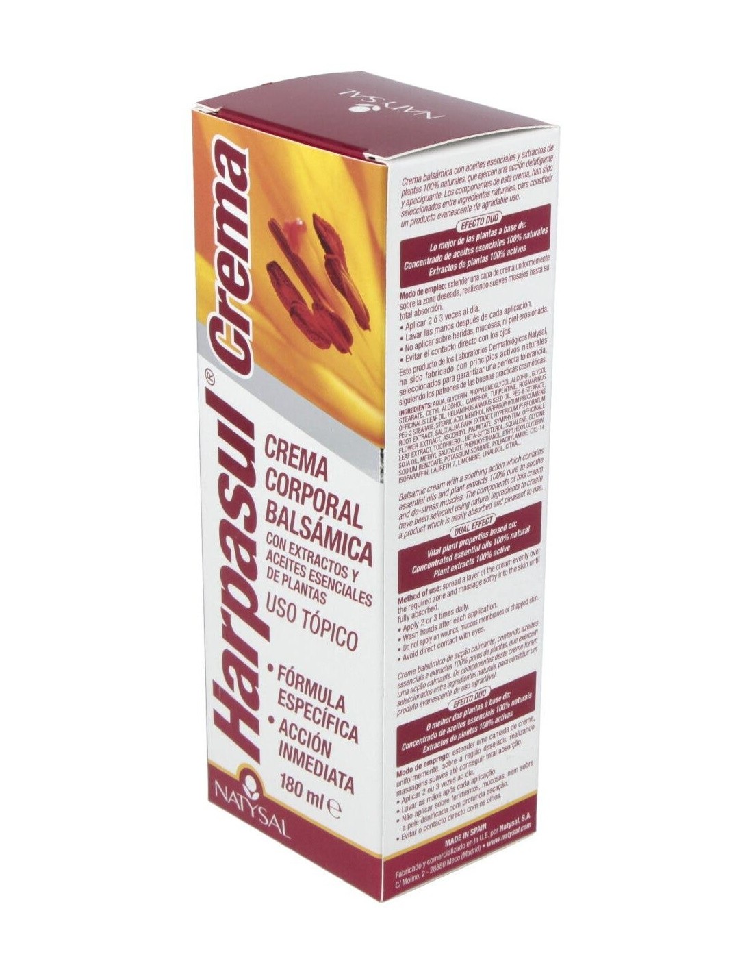 Harpasul Crema Corporal (Harpagofito Forte Crema) 180 ml. de Natysal es una crema diseñada para personas que buscan un cuidado corporal con ingredientes de origen natural. Su formulación está pensada para quienes desean una aplicación tópica que aporte sensación de confort y bienestar en la piel.