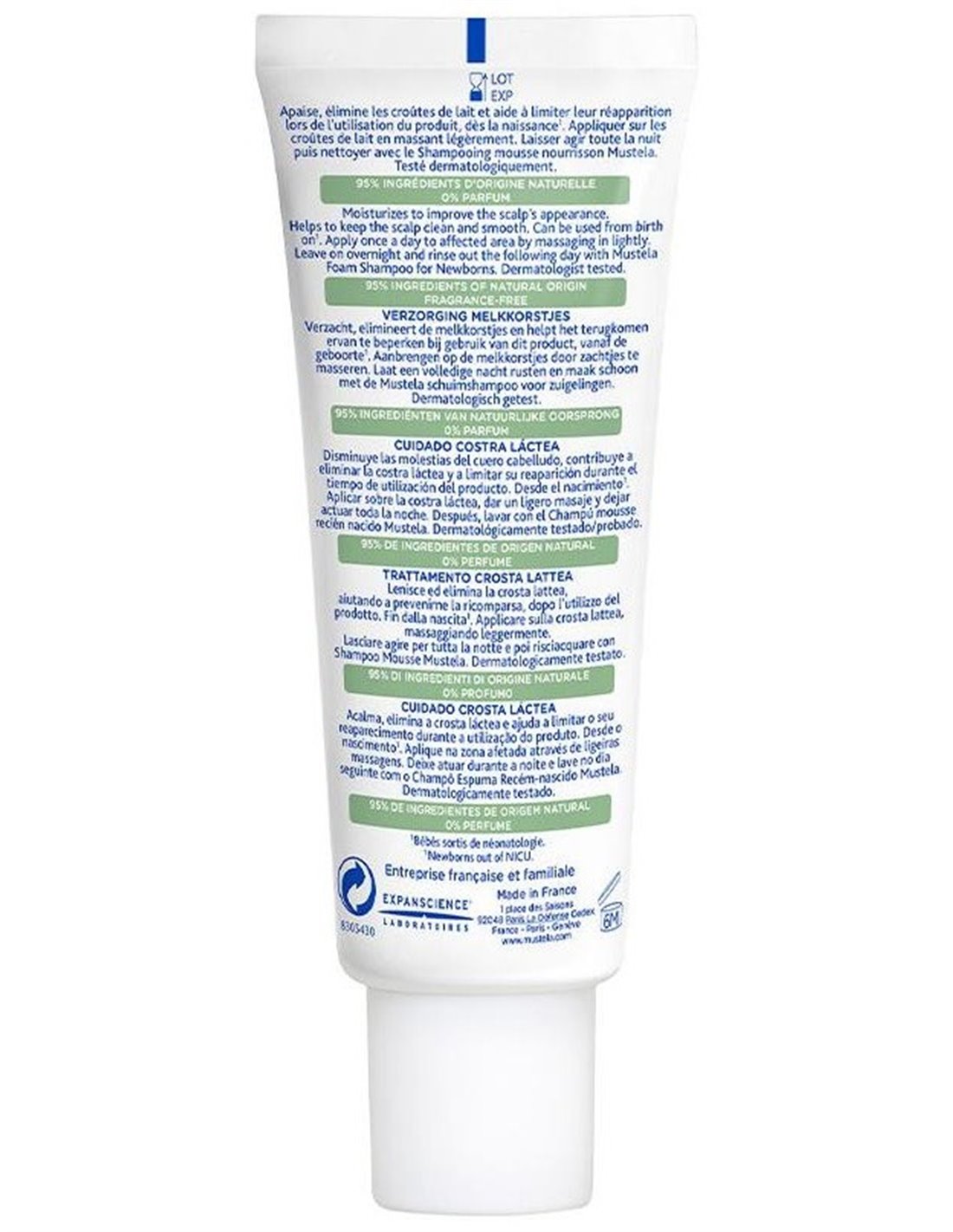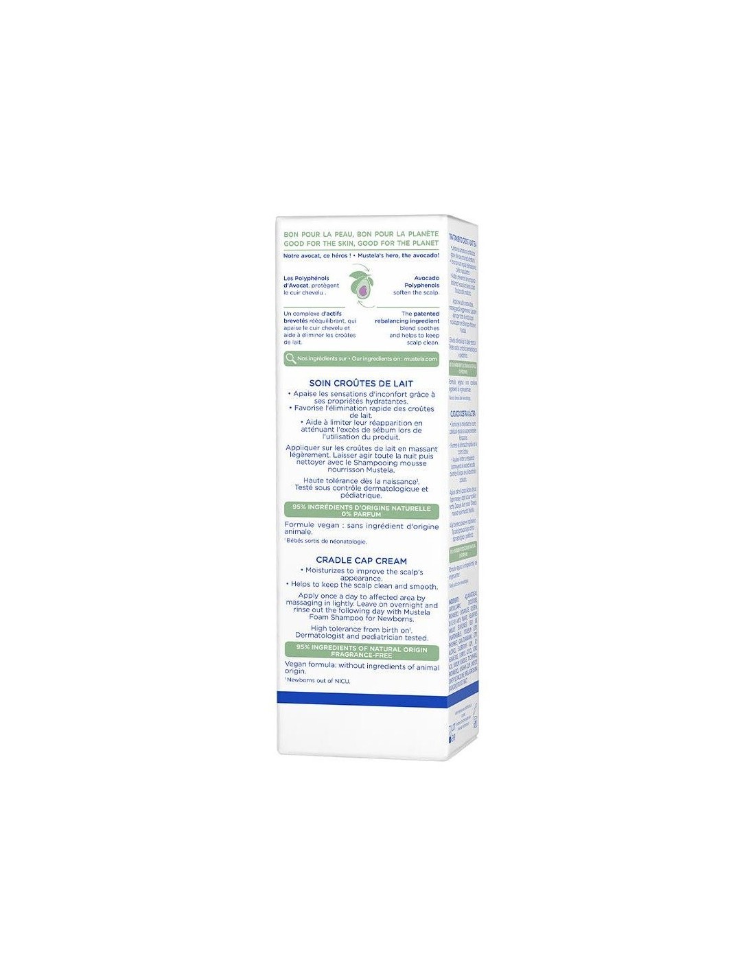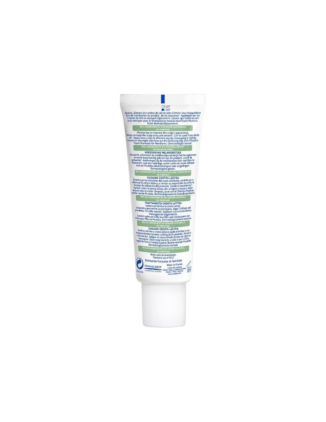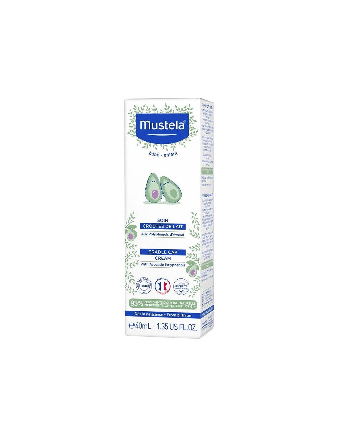 No más costra láctea (o dermatitis seborreica) con nuestra crema para el cuidado de la costra láctea. Este cuidado favorece su eliminación rápida y alivia el malestar del bebé hidratando el cuero cabelludo.El Cuidado Costra Láctea de Mustela también es eficaz a largo plazo. Ayuda a limitar su reaparición reduciendo el exceso de sebo, responsable de la formación de estas costras amarillentas.Esta crema ayuda a eliminar la costra láctea y reduce su reaparición limitando el exceso de sebo. Su textura ligera e hidratante es fácil de aplicar.Ingredientes (INCI):Aqua/Water/Eau, Caprylic/Capric Triglyceride, Propanediol Dicaprylate, Glycerin, Di-C12-13 Alkyl Malate, Helianthus Annuus (Sunflower) Seed Oil Unsaponifiables, Potassium Cetyl Phosphate, Galactoarabinan, Cetyl Alcohol, Sclerotium Gum, 1,2-Hexanediol, Caprylyl Glycol, Citric Acid, Sodium Benzoate, Tocopherol, Propanediol, Xanthan Gum, Undecyl Dimethyl Oxazoline, Persea Gratissima (Avocado) Fruit Extract.95% de ingredientes de origen natural. El 5% restante se utiliza para obtener una textura agradable y proteger la fórmula a largo plazo.Modo de empleo: 1.- Aplica el Cuidado costra láctea directamente sobre las zonas afectadas por la noche. Su práctica cánula permite una aplicación precisa y localizada. 2.- Deja actuar toda la noche. 3.- Por la mañana, limpia el cuero cabelludo y el cabello con un champú específico para eliminar las escamas de costra láctea. Presentación:Envase de 40 ml.
