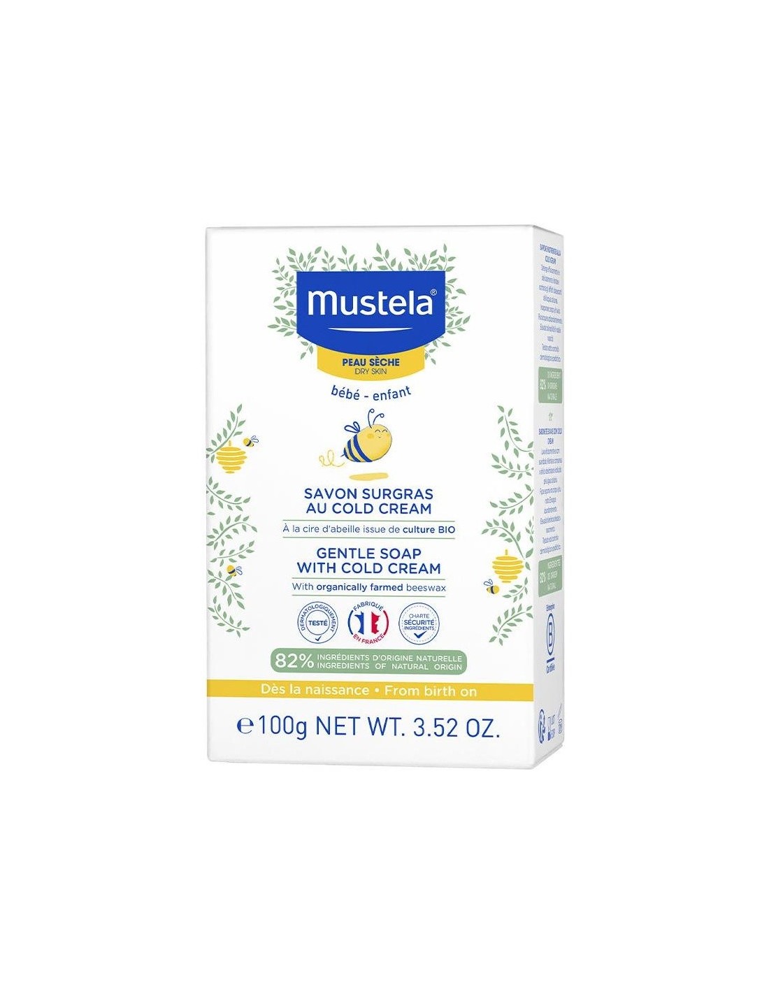 ¡Hora del baño por fin! Conviértelo en un momento agradable con nuestro jabón nutritivo al Cold cream y Cera de abeja Bio, el compañero de baño ideal para el bebé con piel seca.Este jabón hidratante limpia de forma suave y eficaz la cara y el cuerpo del bebé y nutre las pieles secas desde el nacimiento.Más de lo que sentirse bien: el jabón tiene formato sólido y, junto con su fórmula biodegradable** y su cartón reciclable, que proviene de bosques gestionados de forma sostenible, hace que sea un producto más ecológico.Ingredientes (INCI):Sodium Palmate, Sodium Palm Kernelate, Aqua/Water/Eau, Parfum Fragrance, Palm Kernel Acid, Glycerin, Sodium Chloride, Hordeum Vulgare Extract/Extrait Dorge, Octyldodecanol, Cocoglycerides, Tetrasodium Etidronate, Polyglyceryl2 Dipolyhydroxystearate, Polyglyceryl3 Diisostearate, Magnesium Sulfate, Cera Alba/Beeswax/Cire Dabeille, Ceramide Np, Persea Gratissima Avocado Fruit Extract, Phytosphingosine, Sodium Benzoate, Citric Acid.82% de ingredientes de origen natural. El 18% restante son ingredientes para garantizar una textura agradable y una buena protección a largo plazo de la fórmula.Modo de empleo: