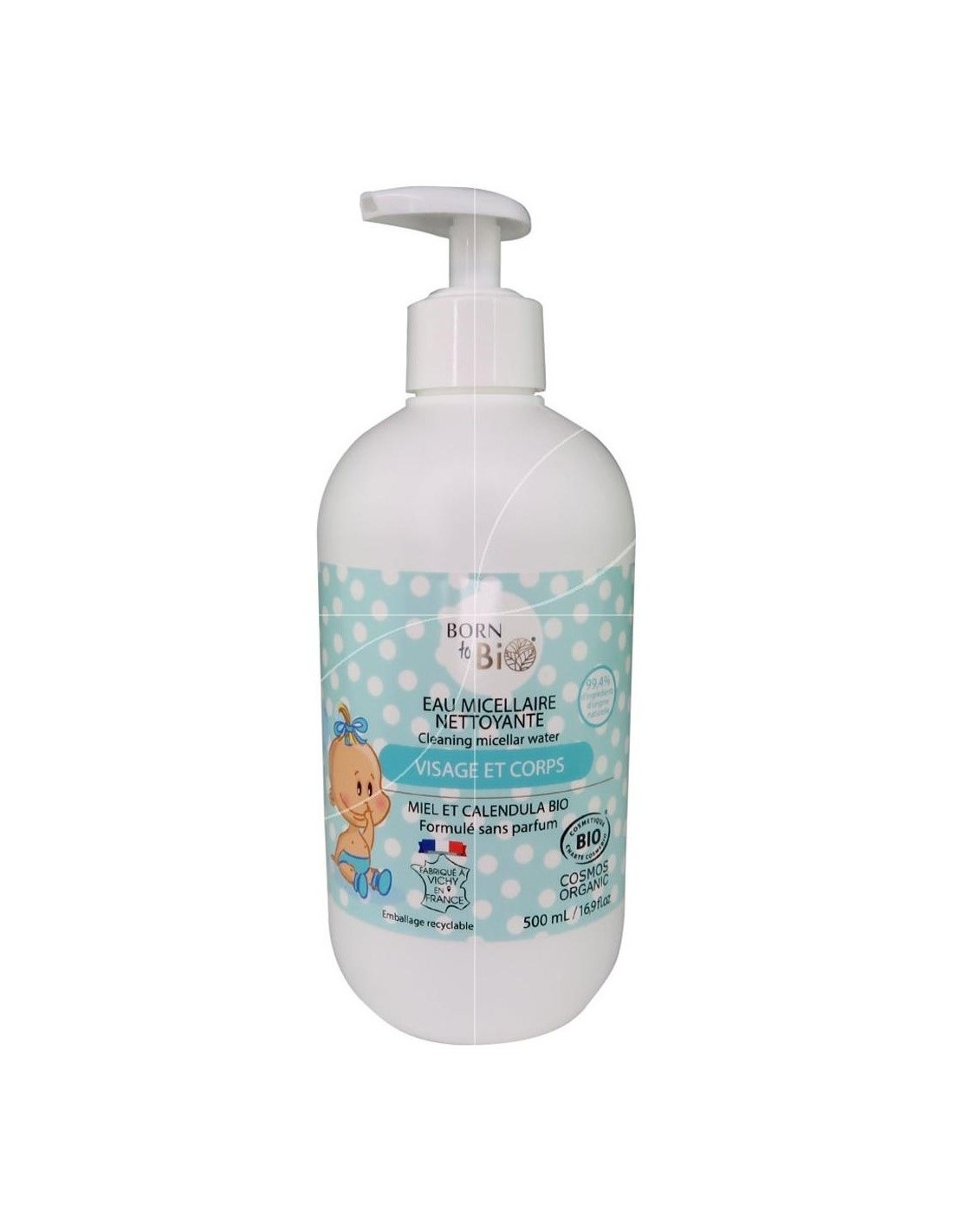 BORN TO BIOUn agua micelar para bebés compuesta por moléculas de agentes limpiadores suaves, limpia delicadamente la piel de los más pequeños. Para el cuerpo, la cara y las nalgas del bebé, sin fragancias ni aceites esenciales. Cosmos Organic.