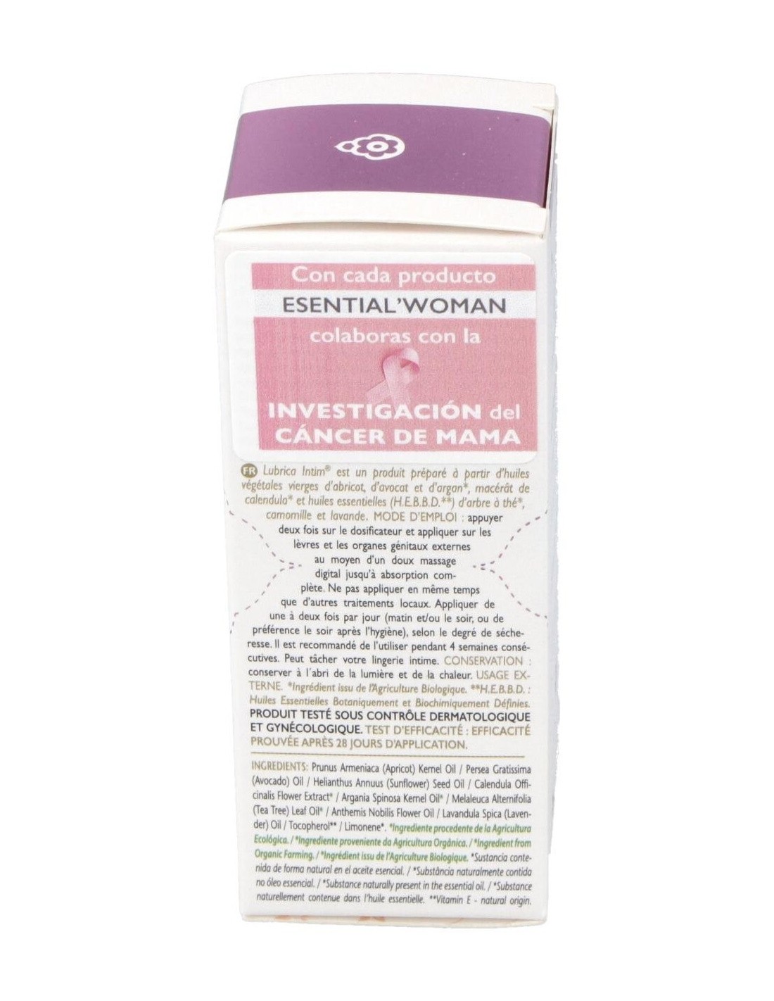 Aceite hidratante íntimo. Ayuda a lubricar la zona genital sin causar irritaciones. Indicado para mujeres con sequedad vaginal. Ayuda a mejorar la capacidad de lubricación, con un efecto que calma los picores y brinda confort a la zona vaginal. Formulado con aceites vegetales vírgenes de albaricoque, aguacate,argán, caléndula, de árbol del té, manzanilla y lavanda.