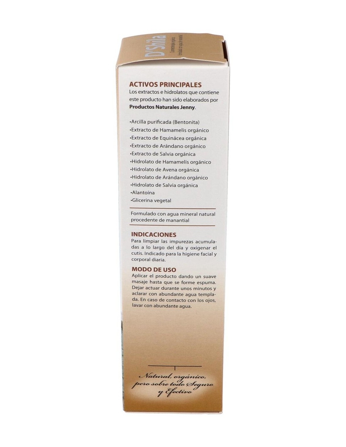 Arcilla purificada (Bentonita), Extracto e hidrolato de Hamamelis orgánica, Extracto de Equinácea orgánica, Extracto e hidrolato de Arándano orgánico, Extracto e hidrolato de Salvia orgánica, Hidrolato de Avena orgánica, Alantoina, Glicerina vegetal. Humectante vegetal. Formulado con agua mineral natural procedente de Manantial.