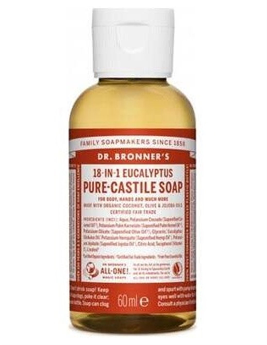 El Jabon Líquido Eucalipto 60Ml. de Dr. Bronners es un jabón natural para personas que buscan limpieza suave y refrescante, formulado con ingredientes orgánicos que aportan frescura y cuidado a la piel.