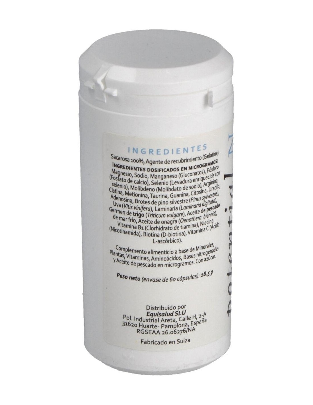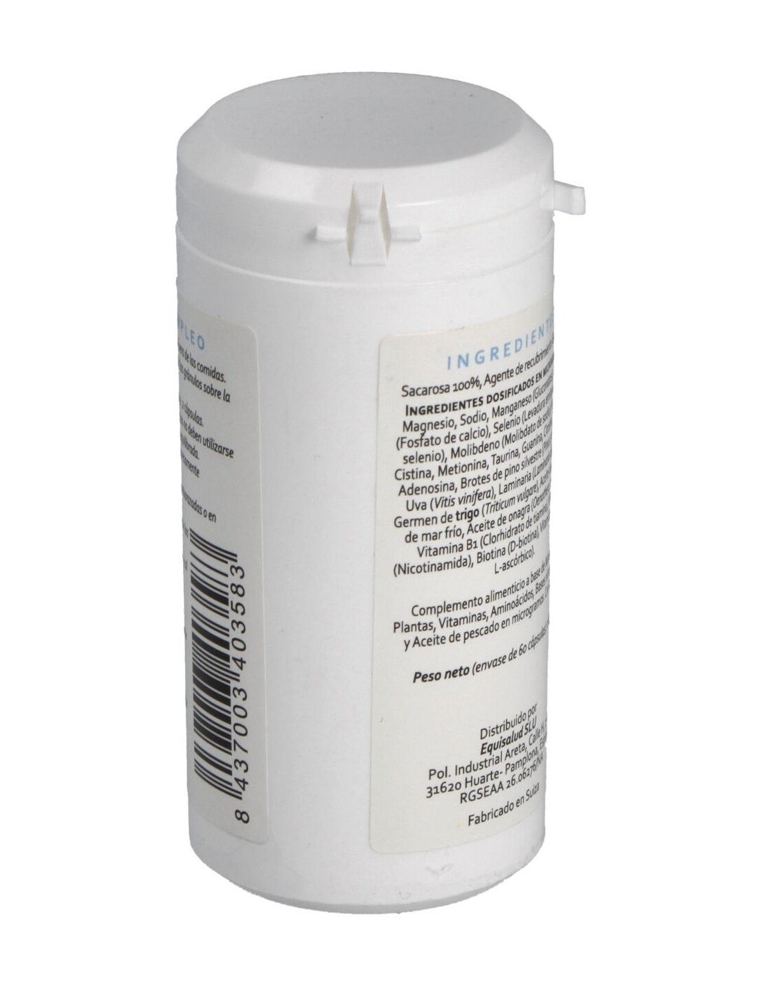 Minerales: magnesio, sodio y manganeso (gluconatos), fósforo (fosfato de calcio), selenio (levadura enriquecida con selenio), molibdeno (molibdato de sodio). Aminoácidos: arginina, cistina, metionina, taurina, guanina, citosina, uracilo, adenosina. Plantas: brotes de pino silvestre (Pinus sylvestris), uva (Vitis vinifera), laminaria (Laminaria digitata), germen de trigo (Triticum vulgare), aceite de pescado de mar frío, aceite de onagra (Oenothera biennis). Vitaminas: vitamina B1 (clorhidrato de tiamina), niacina (nicotinamida), biotina (D-biotina), vitamina C (ácido L-ascórbico).