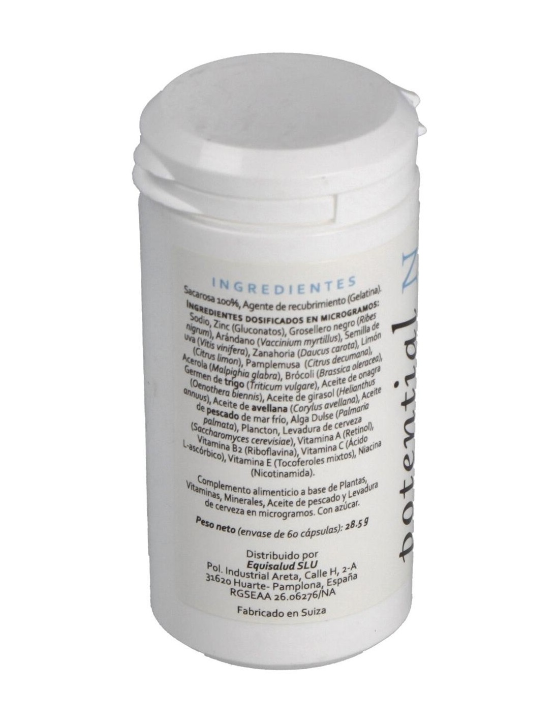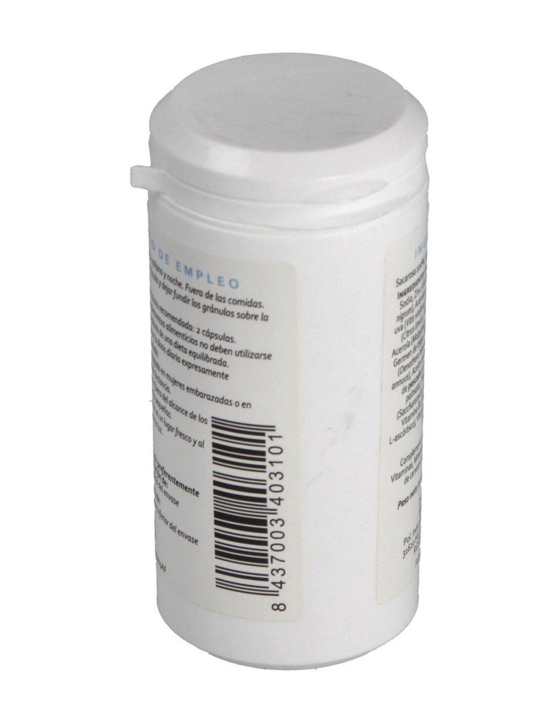 Minerales: sodio y zinc (gluconatos). Plantas: grosellero negro (Ribes nigrum), arándano (Vaccinium myrtillus), semilla de uva (Vitis vinifera), zanahoria (Daucus carota), limón (Citrus × limon), pamplemusa (Citrus decumana), acerola (Malpighia glabra), brócoli (Brassica species), germen de trigo (Triticum vulgare), aceite de onagra (Oenothera biennis), aceite de girasol (Helianthus annuus), aceite de avellana (Corylus avellana), aceite de pescado de mar frío, alga dulse (Palmaria palmata), plancton, levadura de cerveza (Saccharomyces cerevisiae). Vitaminas: vitamina A (retinol), vitamina B2 (riboflavina), vitamina E (mezcla de tocoferoles), vitamina C (ácido L-ascórbico), niacina (nicotinamida). Envoltura: Agente de recubrimiento (gelatina), sacarosa 100%.