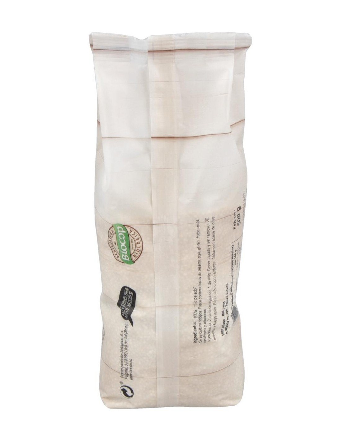 Modo de empleo:Limpiar con agua fría. Cocer tapado y sin remover 20 minutos a fuego lento. 2 tazas de agua por 1 de mijo. Servir sólo o con verduras. Aliñar con aceite de oliva. El mijo cocido se suele emplear como base para preparar tortas, croquetas y albóndigas vegetales.Presentación:Envase de 500 gramos.Recomendaciones y advertencias:Puede contener trazas de altramuces, cacahuetes, frutos secos con cáscara, gluten, sésamo, soja y derivados.