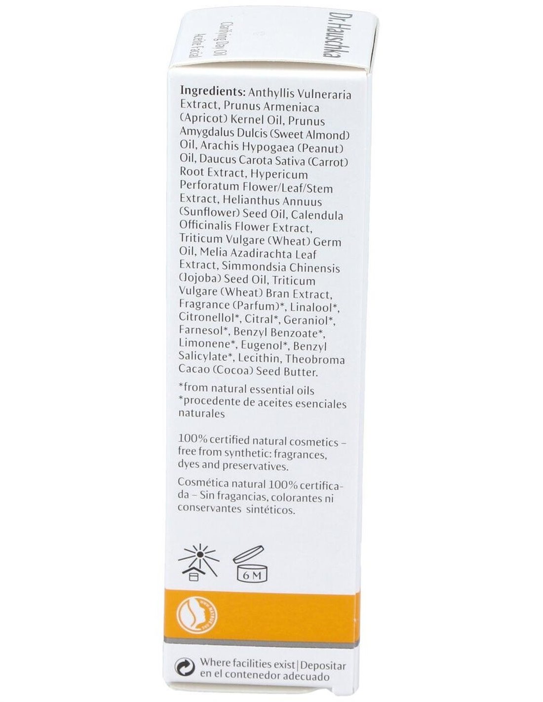 Anthyllis Vulneraria Extract, Prunus Armeniaca (Apricot) Kernel Oil, Prunus Amygdalus Dulcis (Sweet Almond) Oil, Arachis Hypogaea (Peanut) Oil, Daucus Carota Sativa (Carrot) Root Extract, Hypericum Perforatum Flower/Leaf/Stem Extract, Helianthus Annuus (Sunflower) Seed Oil, Calendula Officinalis Flower Extract, Triticum Vulgare (Wheat) Germ Oil, Melia Azadirachta Leaf Extract, Simmondsia Chinensis (Jojoba) Seed Oil, Triticum Vulgare (Wheat) Bran Extract, Fragrance (Parfum)*, Linalool*, Citronellol*, Citral*, Geraniol*, Farnesol*, Benzyl Benzoate*, Limonene*, Eugenol*, Benzyl Salicylate*, Lecithin, Theobroma Cacao (Cocoa) Seed Butter.