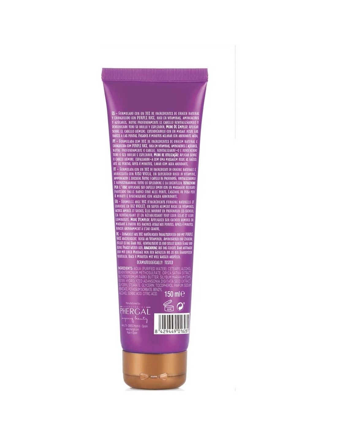 Aplicar la mascarilla nutritiva Purple Rice sobre el cabello húmedo, extendiéndolo con un masaje desde las raíces a las puntas. Pasados 4 minutos aclarar con abundante agua.